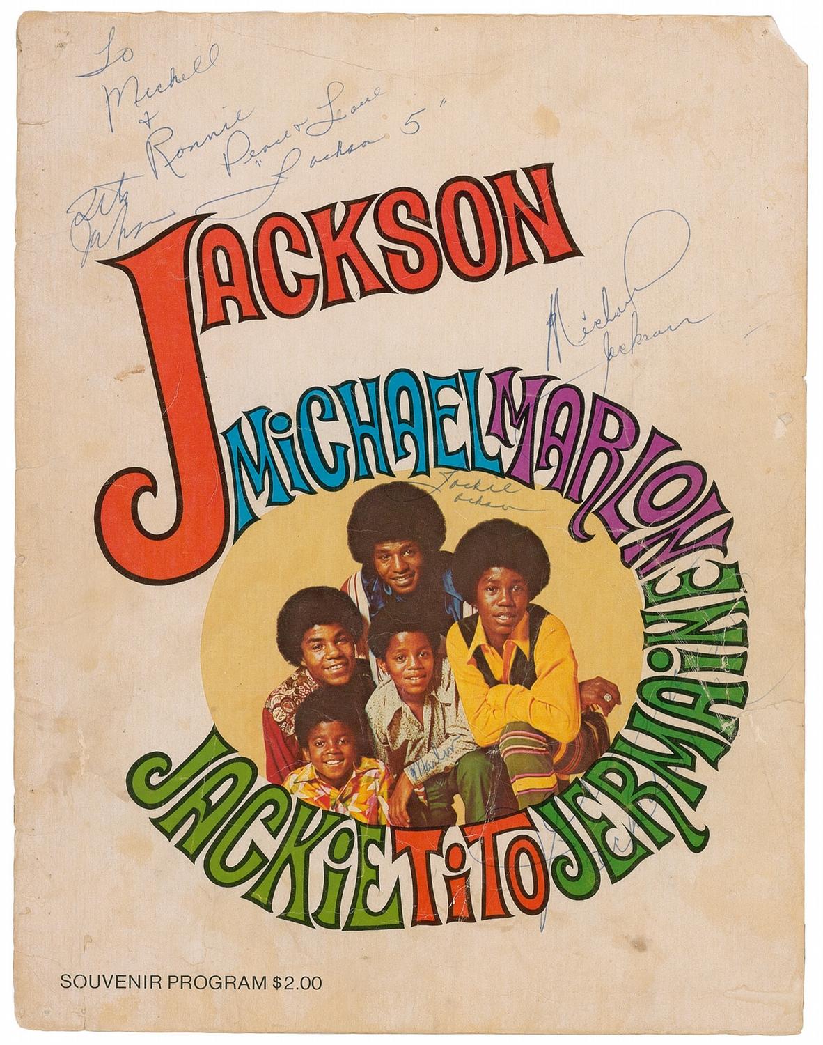 Souvenir program cover from the 1970 Jackson 5 tour, 10 x 13, signed in blue ballpoint by all five brothers—Michael, Marlon (signing only his first name), Tito, Jackie, and Jermaine. Jackie has also inscribed “To Michell & Ronnie, Peace & Love, Jackson 5.” In overall very good condition, with mild to moderate creasing and handling wear, toning, and mild soiling, small holes, torn top right corner, and a couple of edge tears and areas of thin paper. This program was issued for the group’s first tour and signed when Michael was a mere 12 years old!