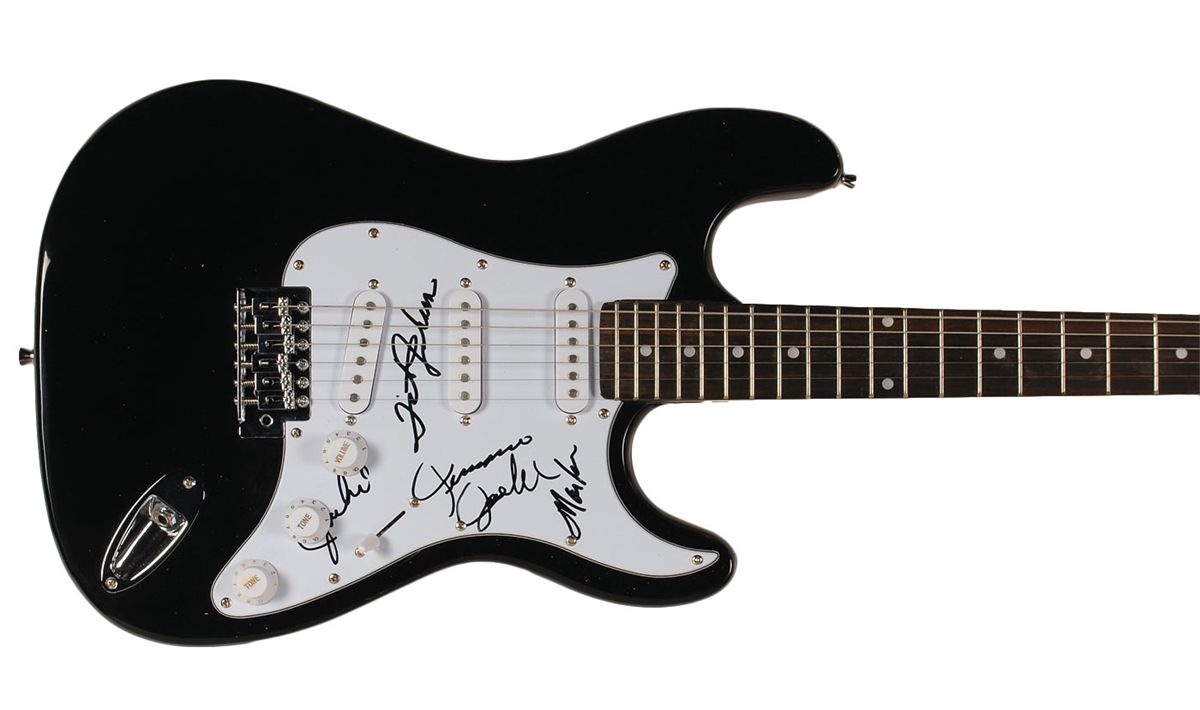Black-bodied Crescent ‘stratocaster-style’ electric guitar, signed on the white pickguard in black felt tip, “Jackie,” “Marlon,” “Tito Jackson,” and “Jermaine Jackson.” In fine condition. Oversized.