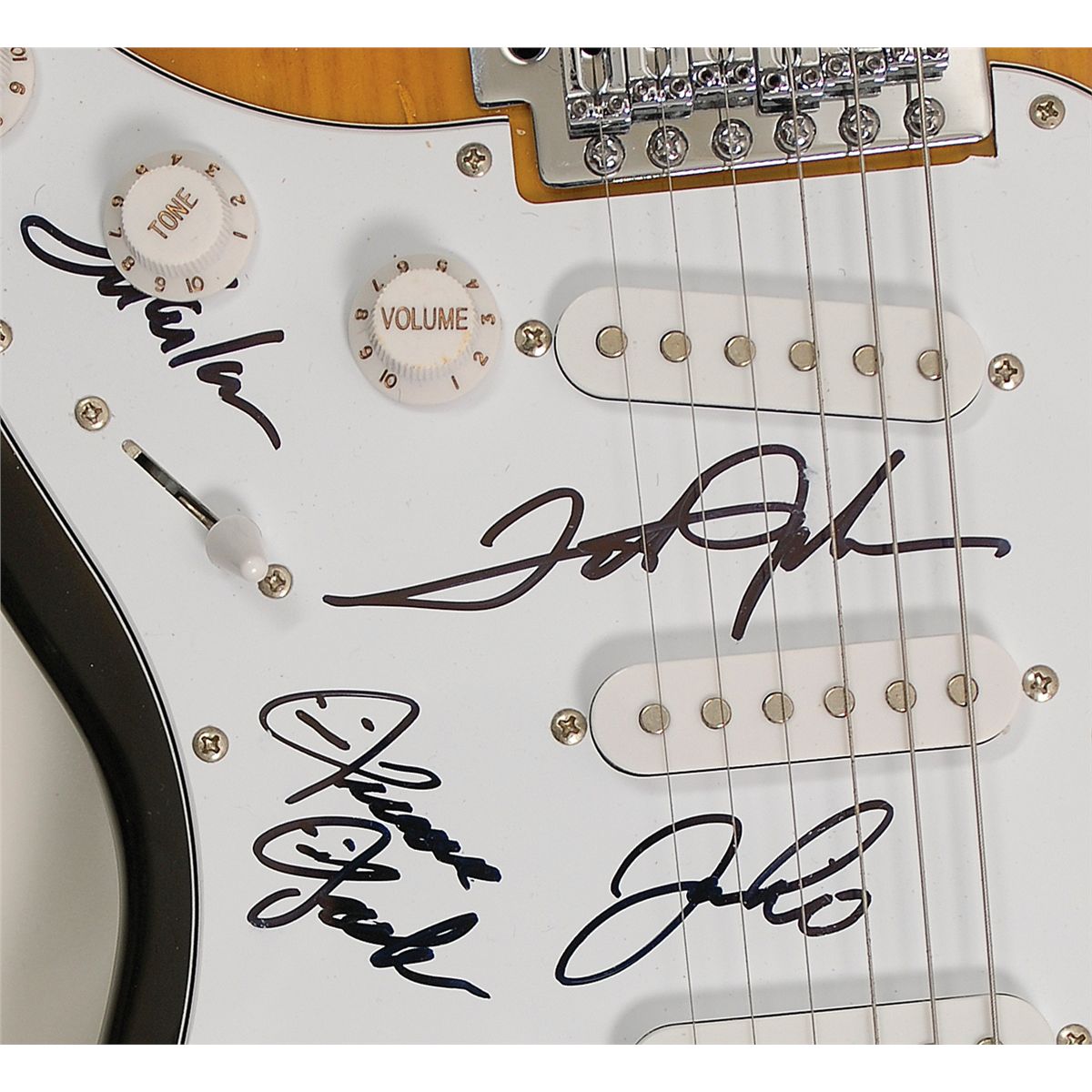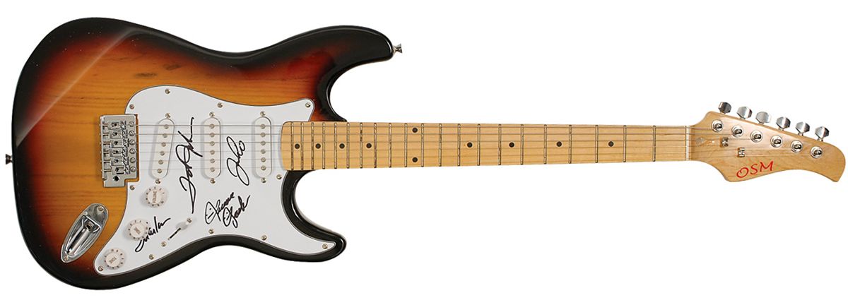 Attractive sunburst-finish OSM ‘stratocaster-style’ electric guitar, signed on the white pickguard in black felt tip by Marlon, Jermaine, Tito, and Jackie Jackson. In fine condition. Oversized.