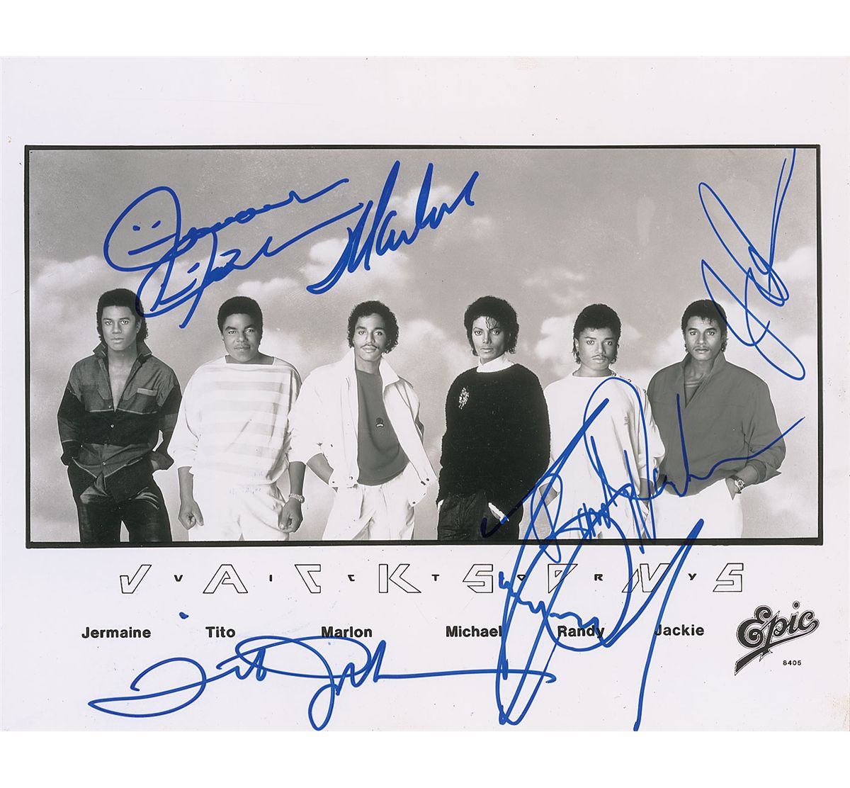 Glossy 10 x 8 Epic Records publicity photo of the Jackson 5, signed in blue felt tip by Michael Jackson and his brothers, Tito, Jermaine, Marlon, Randy, and Jackie. In fine condition. Accompanied by a certificate of authenticity from Roger Epperson/REAL.