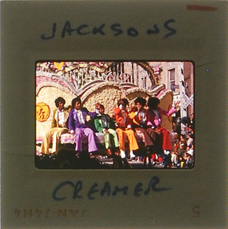 One original unsigned Kodachrome color slide of the Jackson 5 on a parade float, the image measuring 1.25 x 1 inside a 2 x 2 cardboard mount. Mount bears ink notations from the photographer, Richard Creamer. In overall fine condition. Provenance: Richard Creamer Estate. Creamer was a famous Rolling Stone photographer very active and well known in the 1970s Los Angeles Rock scene. The collection of Creamer photos offered in this auction were kept in his personal collection and several appeared in magazines.