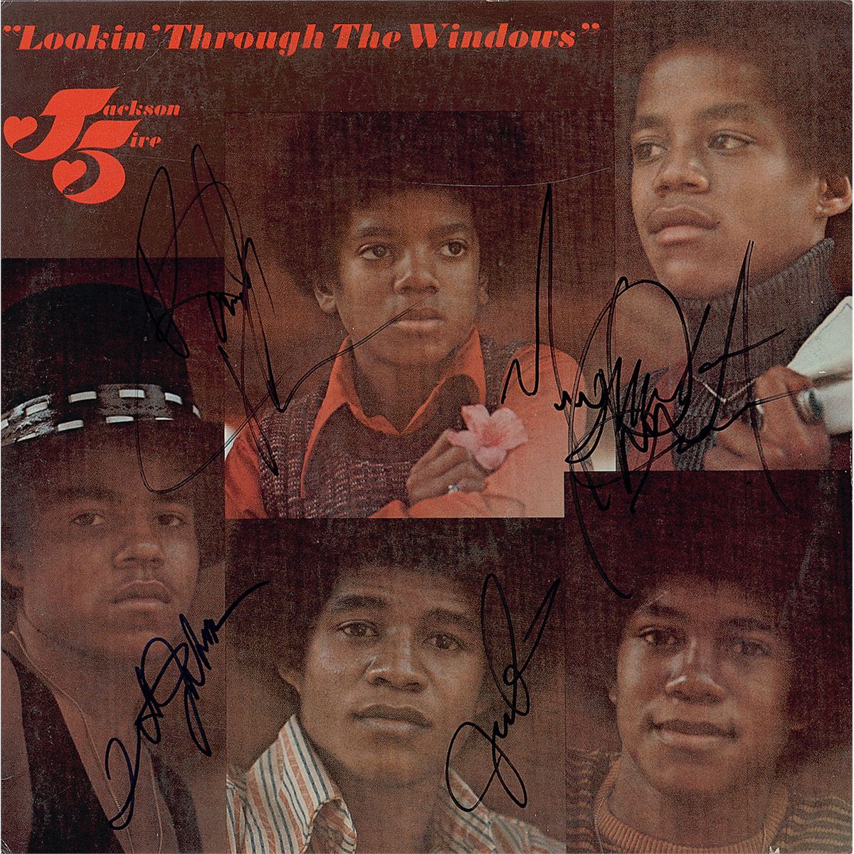 Lookin’ Through the Windows album signed on the front cover in black felt tip by Michael, Marlon, Randy, and Jermaine Jackson, and in blue felt tip by Tito Jackson. In fine condition, with some scattered light wear to edges and Randy’s and Michael’s signatures overlapping. The record is included. Accompanied by a full letter of authenticity from Roger Epperson/REAL.