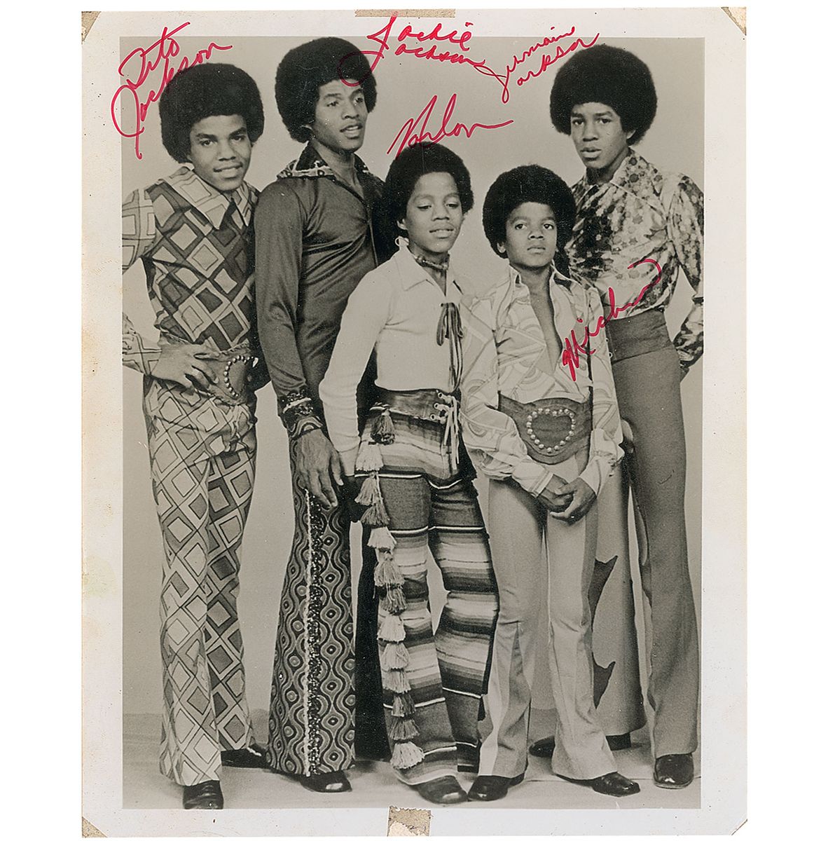 Vintage glossy 8 x 10 publicity photo of the Jackson 5, signed in red felt tip by Michael Jackson and his brothers, Tito, Jermaine, Marlon, and Jackie. In very good condition, with mild scattered surface creases, toned tape remnants to corners and borders, and paper loss to lower left corner tip. Accompanied by a certificate of authenticity from Roger Epperson/REAL and a note from the original recipient, stating that she was traveling from Atlanta to Birmingham in 1970 and encountered the brothers on the plane; the flight attendant offered to get her a signed photo of the group, which she happily accepted.