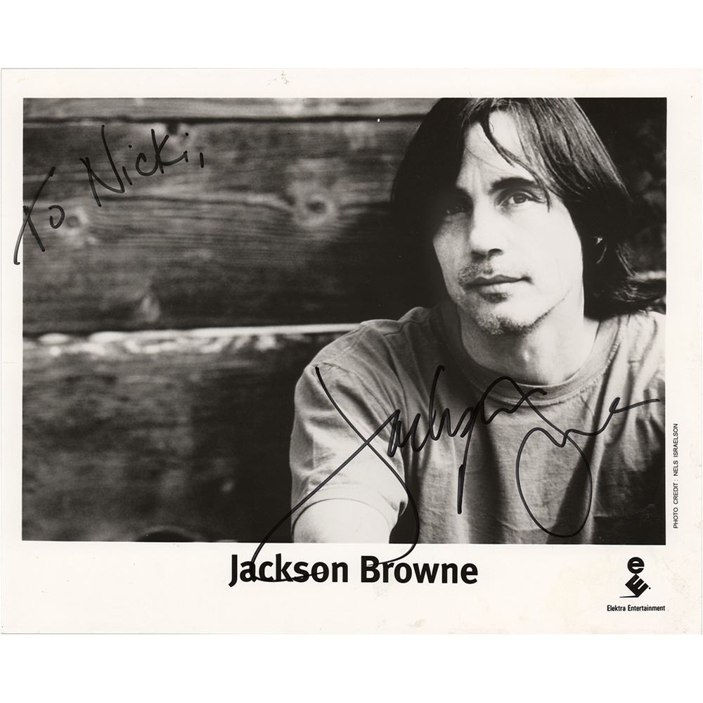 Satin-finish 10 x 8 Elektra Records publicity photo of Browne, signed and inscribed in black felt tip, "To Nicki, Jackson Browne.†In fine condition, with one crease to the lower background area.