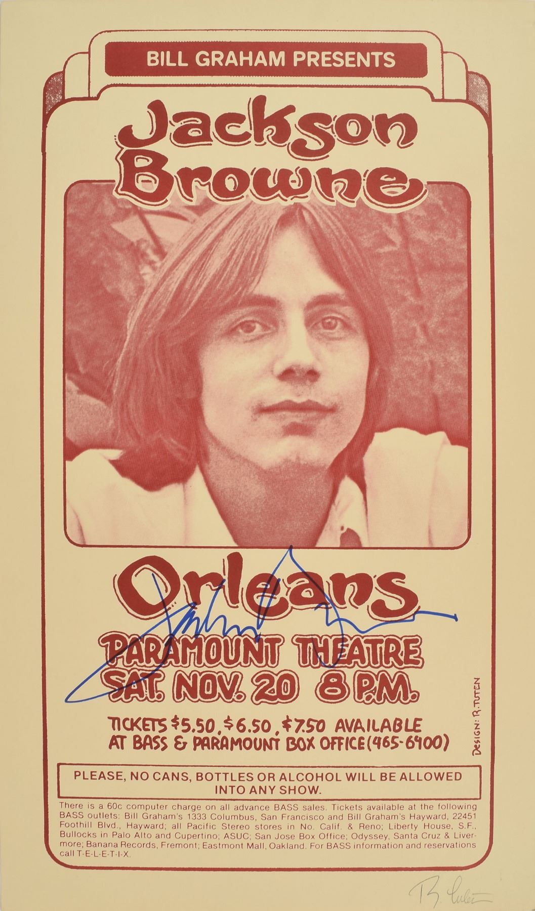 Original color 12 x 20.75 first printing poster for a Jackson Browne concert at the Paramount Theater in Oakland, California, on November 20, 1976, listing Orleans as the supporting act, signed in blue felt tip by Browne, and in pencil by the poster designer Randy Tuten. In fine condition.
