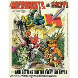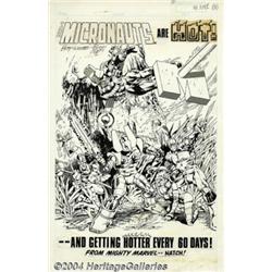 Jackson "Butch" Guice - Original Art for The Micronauts Marvel Promo Poster (Marvel, 1983). This art was used for a promotional poster for Marvel's Micronauts comic book. Acroyear, Space Glider, Bug, and the rest of the Micronauts, who were based on the Mego toys, are "hot," thanks to Jackson Guice's detailed artwork! The art paper measures 11" x 17", with an image size of 10" x 15". The art is autographed by Butch Guice at the upper left, and signed and dated at the lower left. This lot includes a copy of the printed color poster, which measures an overall size of 11" x 14", and is also autographed. The work in terrific shape, and has all of its original type-element stats intact. Important notice: Heritage usually auctions material at the rate of 200-250 lots per hour. On some occasions eBay Live bid software or the Internet may not be able to keep up with the pace of the auction. We recommend placing a realistic absentee bid now as insurance to avoid disappointment. Occasionally the auctioneer may eliminate or reject an eBay Live bid, and the auctioneer may also reopen a lot after the close of the eBay live bidding (usually because we missed an audience bid), and may reject your bid even if it shows you as the winning bidder. By bidding via eBay Live, you agree that Heritage may award the lot to another bidder at its sole discretion under the circumstances described above or any other reasonable circumstances. Since eBay bids are not shown to us until we open the lot on the floor, we treat those bids just like floor bids. In most cases the floor responds before the eBay bid is presented to us, due to Internet lag time, so for consistency we have made it a policy that floor bids are always considered first over tie eBay live bids. Also please note that all Heritage lots purchased through eBay Live carry a 20% Buyer's Premium. Please make sure you read the Terms and Conditions before you bid.