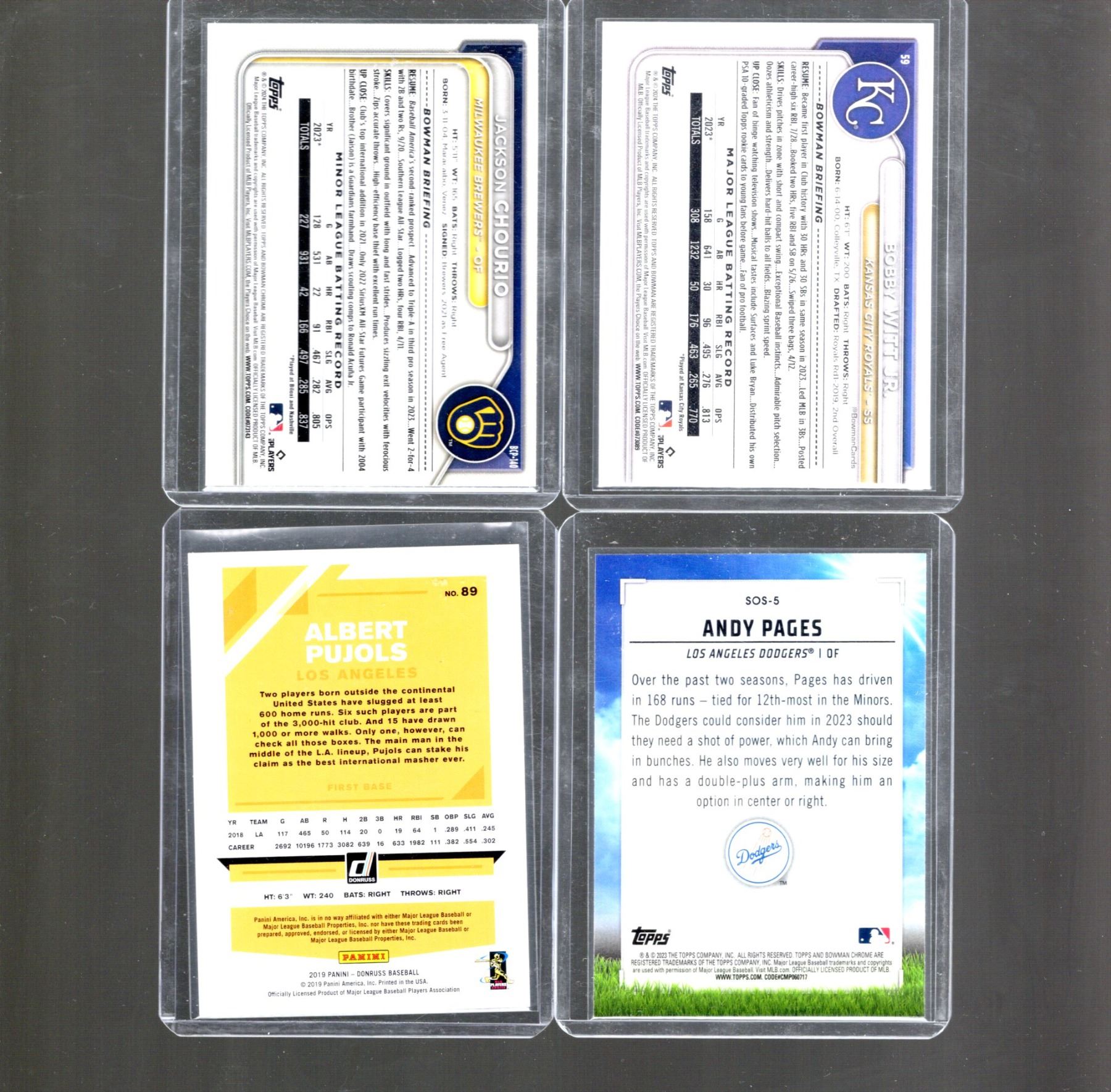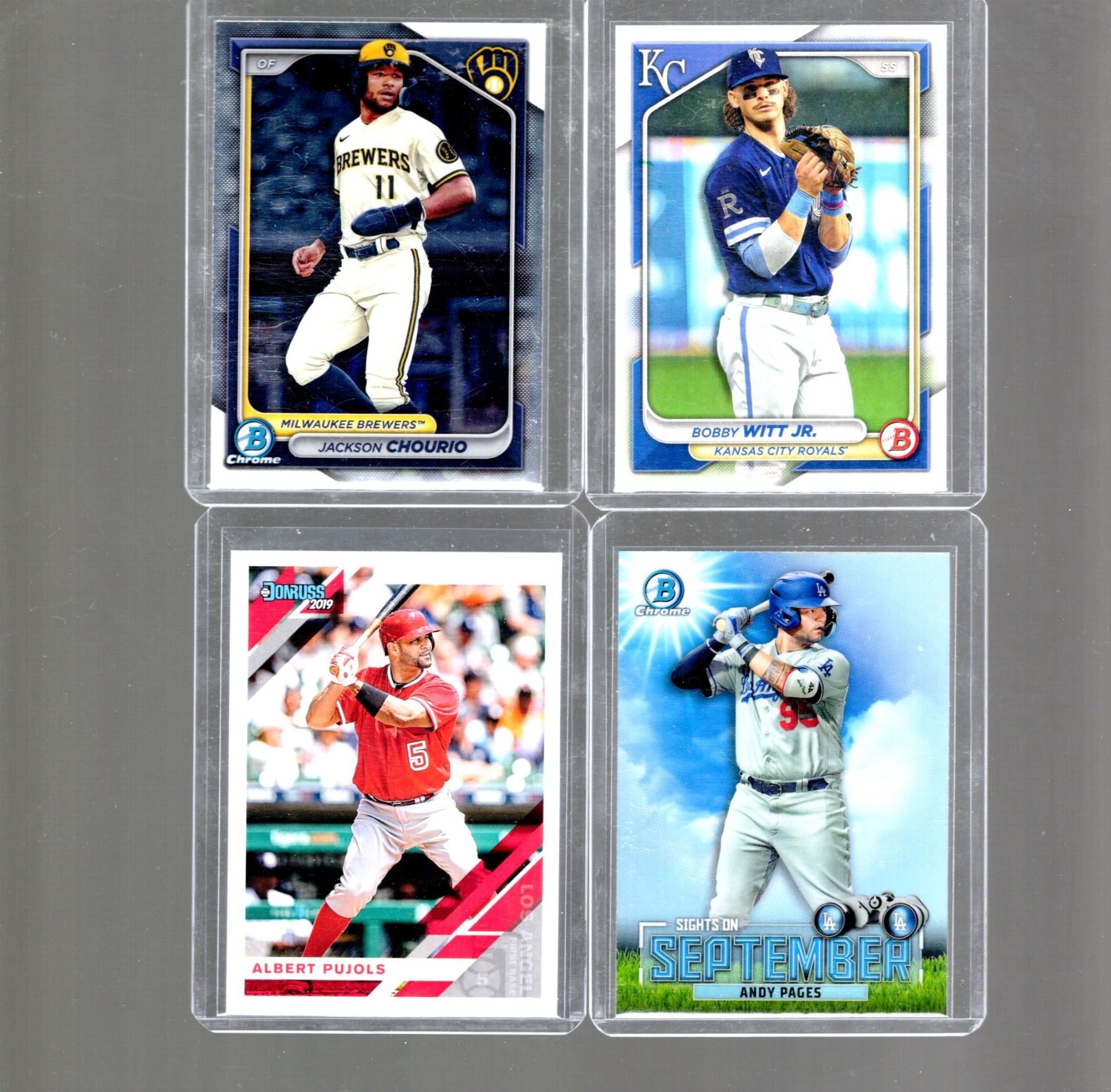 Jackson Chourio Chrome Prospect, Bobby Witt, Jr., Andy Pages Chrome Sights on September, Albert Pujols Donruss