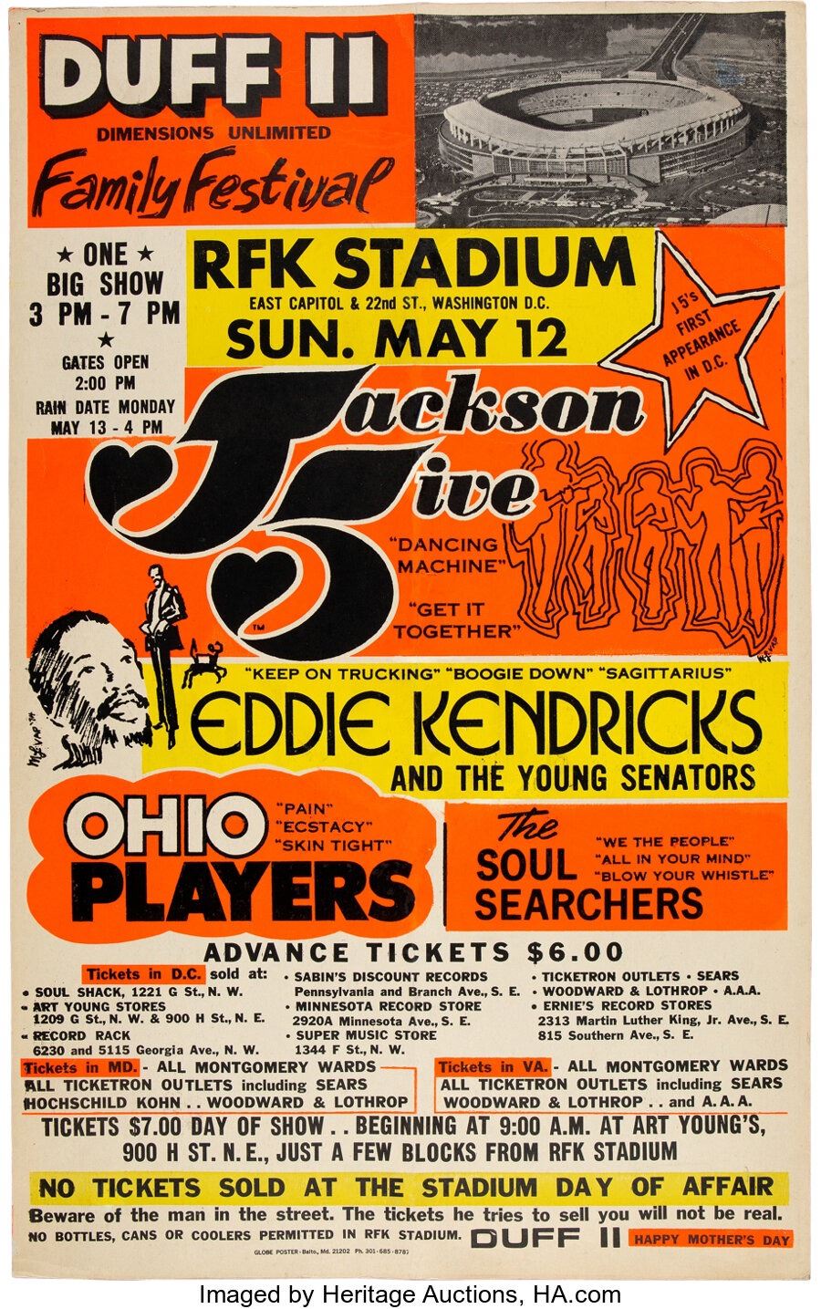 The J5, featuring 15-year-old Michael Jackson, had a #2 pop hit that spring with "Dancing Machine," plugged on the poster. Also listed is "Get It Together," a #2 RB hit for them the previous year. Kendricks, as an original member of the Temptations, had sang lead on "The Way You Do the Things You Do," "Get Ready" and "Just My Imagination (Running Away with Me)." Eddie even gets a little bonus drawing to represent his current hit "Son of Sagittarius." And the Ohio Players had achieved only one Top 10 RB hit when this poster was printed, but were warming up dramatically and would break through to superstardom the following year. Measures 22" x 35 1/4" and grades to restored Very Good condition. COA from Heritage Auctions.
