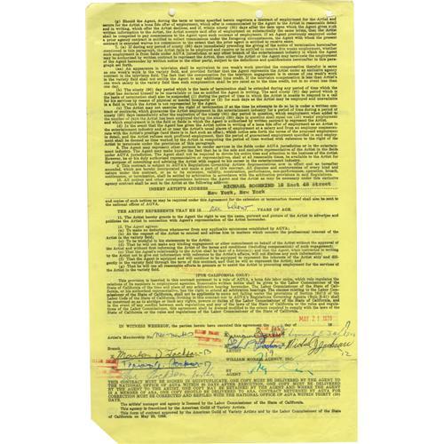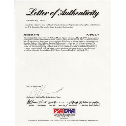<B>Jackson Five Signed Contract.</B></I> One-page, double-sided standard agency contract on William Morris letterhead, dated May 21, 1970, signed on the reverse in ink and felt tip by Marlon, Tito, Jermaine, John, Sigmund, and (then) 12-year-old Michael Jackson, as well as father/manager Joe Jackson -- just as the band began to enter their heyday. In Very Fine condition with punch and staple holes tot he top edge, expected folds, a light ink stroke through a letter in Michael's signature, and some light wrinkling. <I>Accompanied by a COA from PSA/DNA.</B></I><BR><BR><b>Shipping:</b> Small Flat (<a target="_blank" href="http://www.heritageauctions.com/common/shipping.php">view shipping information</a>) <BR><BR><B>Important notice: