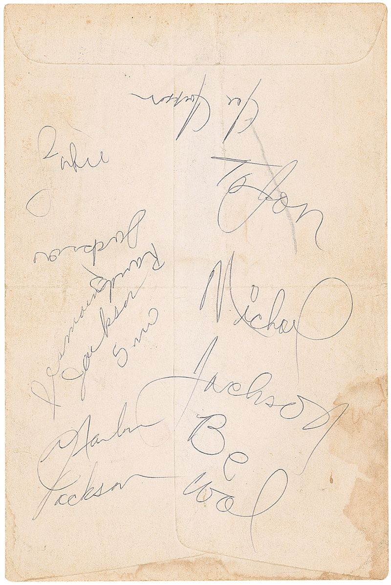 Vintage ballpoint signatures, “To Jon, Michael Jackson, Be Cool,” “Marlon Jackson,” “Jermaine Jackson 5,” “Randy Jackson,” “Jackie,” and “Joe Jackson,” on the reverse of an off-white 6 x 9 Cincinnati Royals Basketball Club envelope. In very good condition, with intersecting folds, scattered creasing and soiling, and foxing and dampstaining to edges.