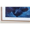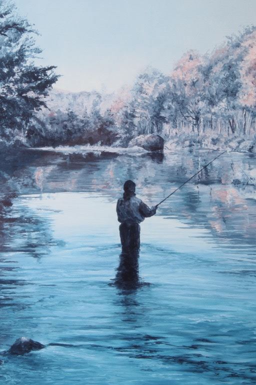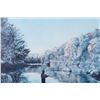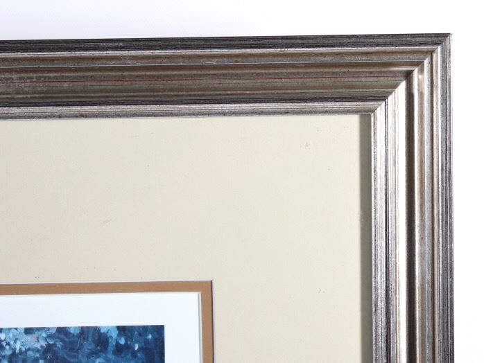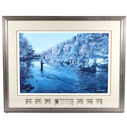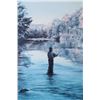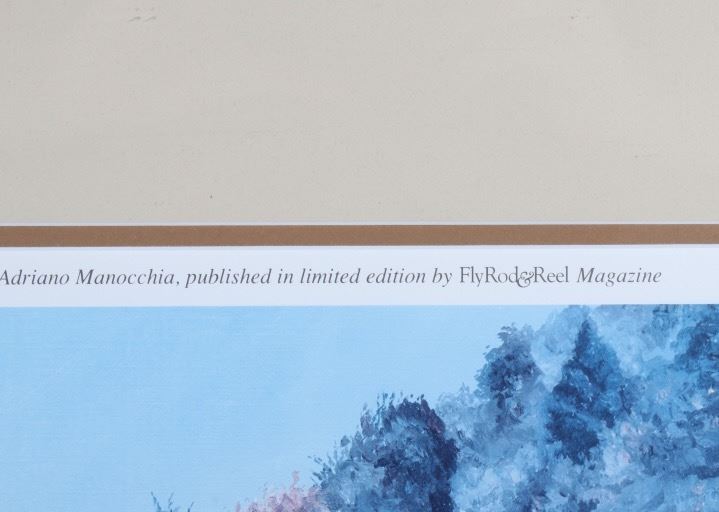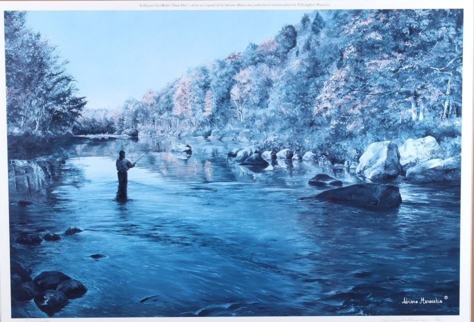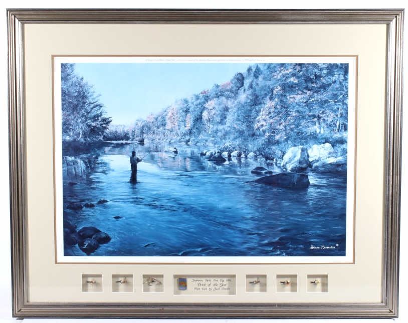 Featured in this lot we have a Jackson Hole One Fly print by Adriano Manocchia. The painting shows the image of a lone fly fisherman knee deep in the Jackson river with a clear sky overhead. The piece is titled "It Doesn't Get Better Than This" and is an original Adriano Manocchia print. The bottom the the piece shows six flies set in the border with the center marked "Jackson Hole One Fly 1991 Print of the Year Flies tied by Jack Dennis". The piece is in good condition overall and is set into a silver metal frame. The frame measures 37 3/4" wide by 29 7/8".