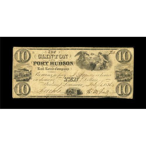 <B>Jackson, LA- Clinton & Port Hudson Rail Road Company</B></I> $10 Feb. 1, 1836<BR> A second rarity from this early Louisiana railroad issuer. Pleasing <B>Fine+.</B></I><BR><I>From The Collection of a Louisiana Gentleman.</B></I><BR><BR><b>Shipping:</b> Coins & Currency (<a target="_blank" href="http://www.heritageauctions.com/common/shipping.php">view shipping information</a>)