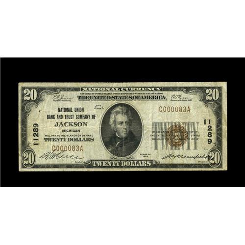 <B>Jackson, MI</B></I> - $20 1929 Ty. 1 <B>National Union Bank & TC</B></I> Ch. # 11289<BR>While over fifty large examples are listed in the Kelly census from here, just ten small notes have been recorded, with this one of that number. Pleasing <B>Fine.</B></I>