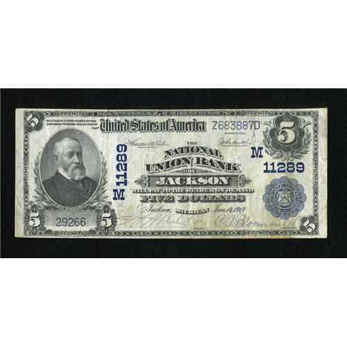 <B>Jackson, MI</B></I> - $5 1902 Plain Back Fr. 606 <B>The National Union Bank</B></I> Ch. # (M)11289<BR>This attractive <B>Very Fine</B></I> retains two stamped signatures and bold paper. There is some toning of the paper noted, but it does not affect the overall eye appeal.<BR><BR><b>Shipping:</b> Coins & Currency (<a target="_blank" href="http://www.heritageauctions.com/common/shipping.php">view shipping information</a>)