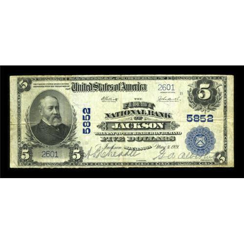 <B>Jackson, MN</B></I> - $5 1902 Plain Back Fr. 607 <B>The First NB</B></I> Ch. # 5852<BR> Bright paper is adorned with strong stamped signatures. The margins are even and solid, adding to the overall eye appeal. A quick look at the notes enumerated in the census reveals that this note may have a claim to be the finest known for the bank, as only one other Very Fine is listed. <B>Very Fine.<BR></B></I><I>From The Walla Walla Collection</B></I><BR><BR><b>Shipping:</b> Coins & Currency (<a target="_blank" href="http://www.heritageauctions.com/common/shipping.php">view shipping information</a>)