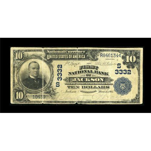 <B>Jackson, MS</B></I> - $10 1902 Plain Back Fr. 624 <B>The First NB</B></I> Ch. # (S)3332<BR> A few hard folds are noticed on this well circulated capital note. Some nicks into the design are also seen. <B>Very Good-Fine</B></I>.<BR><I>From The Kansas City Collection.</B></I><BR><BR><b>Shipping:</b> Coins & Currency (<a target="_blank" href="http://www.heritageauctions.com/common/shipping.php">view shipping information</a>)