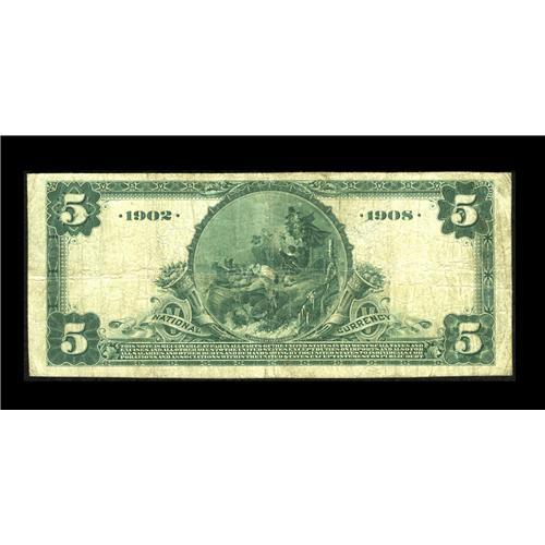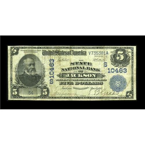 <B>Jackson, MS</B></I> - $5 1902 Date Back Fr. 597 <B>The State NB</B></I> Ch. # (S)10463<BR>This note last appeared in our 2004 Long Beach Sale, where it was described, "A great Mississippi rarity, as this bank barely had a chance to unpack its furniture before liquidating less than a year after it opened in 1913. Until earlier this year this bank was unreported, with both this example and a $50 Date Back surfacing within months of each other in opposite sections of the country. The $50 Date Back, in about the same grade as this piece, recently sold for $11,500, and has now passed into extremely strong hands. This offering may well mark the final opportunity for any collector to own any note on this bank for the next generation. Pen signed <B>About Fine.</B></I> " The latest census still shows only this note and the aforementioned $50. Expect this capital note to hammer in the range of...