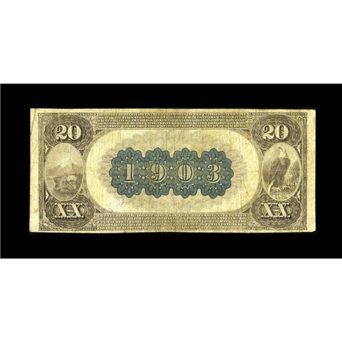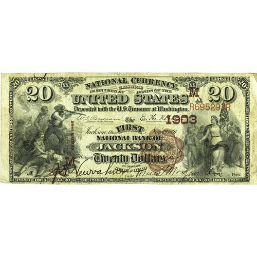 <B>Jackson, OH</B></I> - $20 1882 Brown Back Fr. 499 <B>The First NB</B></I> Ch. # (M)1903<BR>The census now lists just a single $20 Brown Back, this <B>Fine+</B></I> example that displays ample margins all around and is Vice-Presidentially signed. A very scarce item from the only issuer in this Jackson County locale.