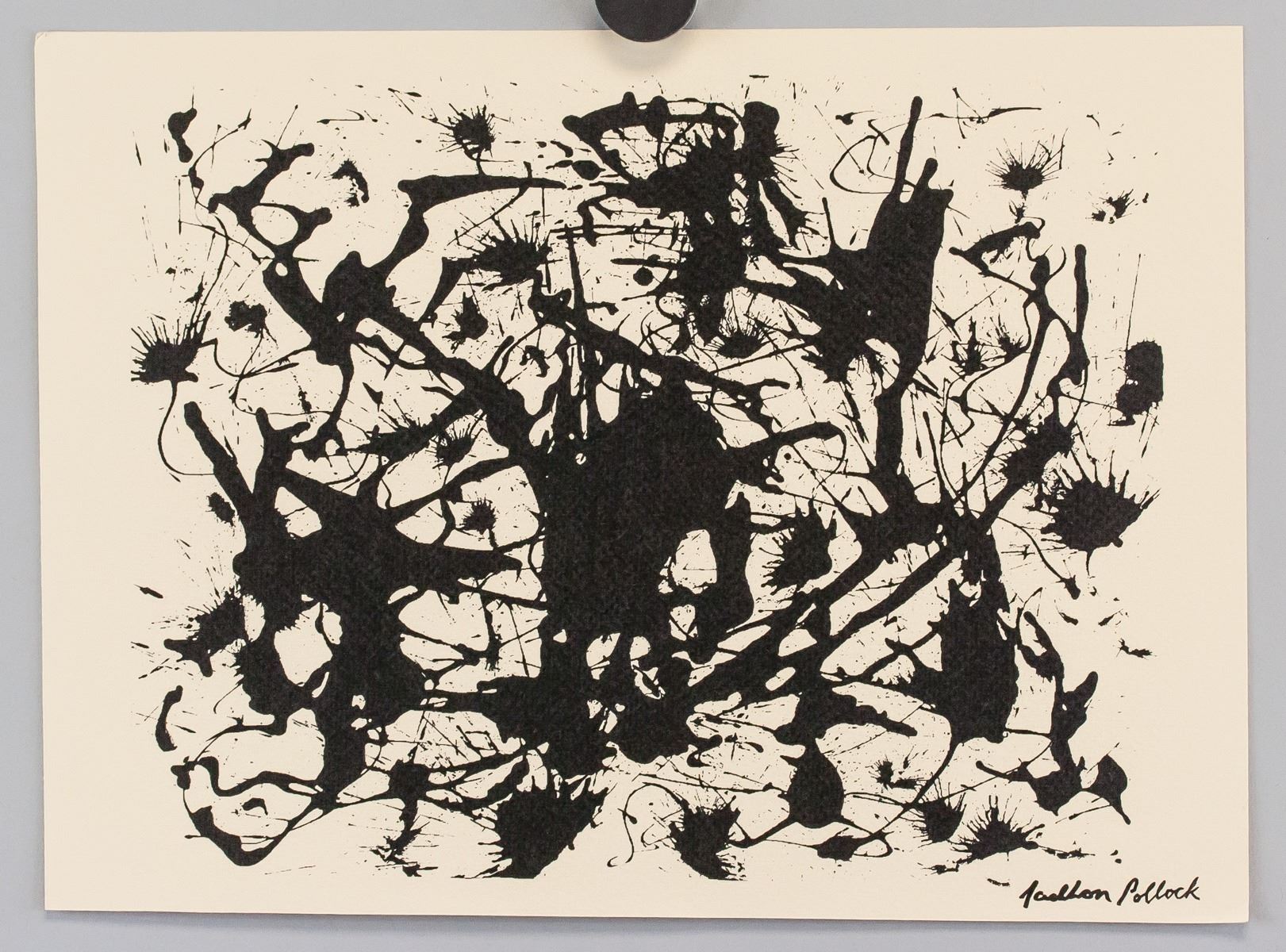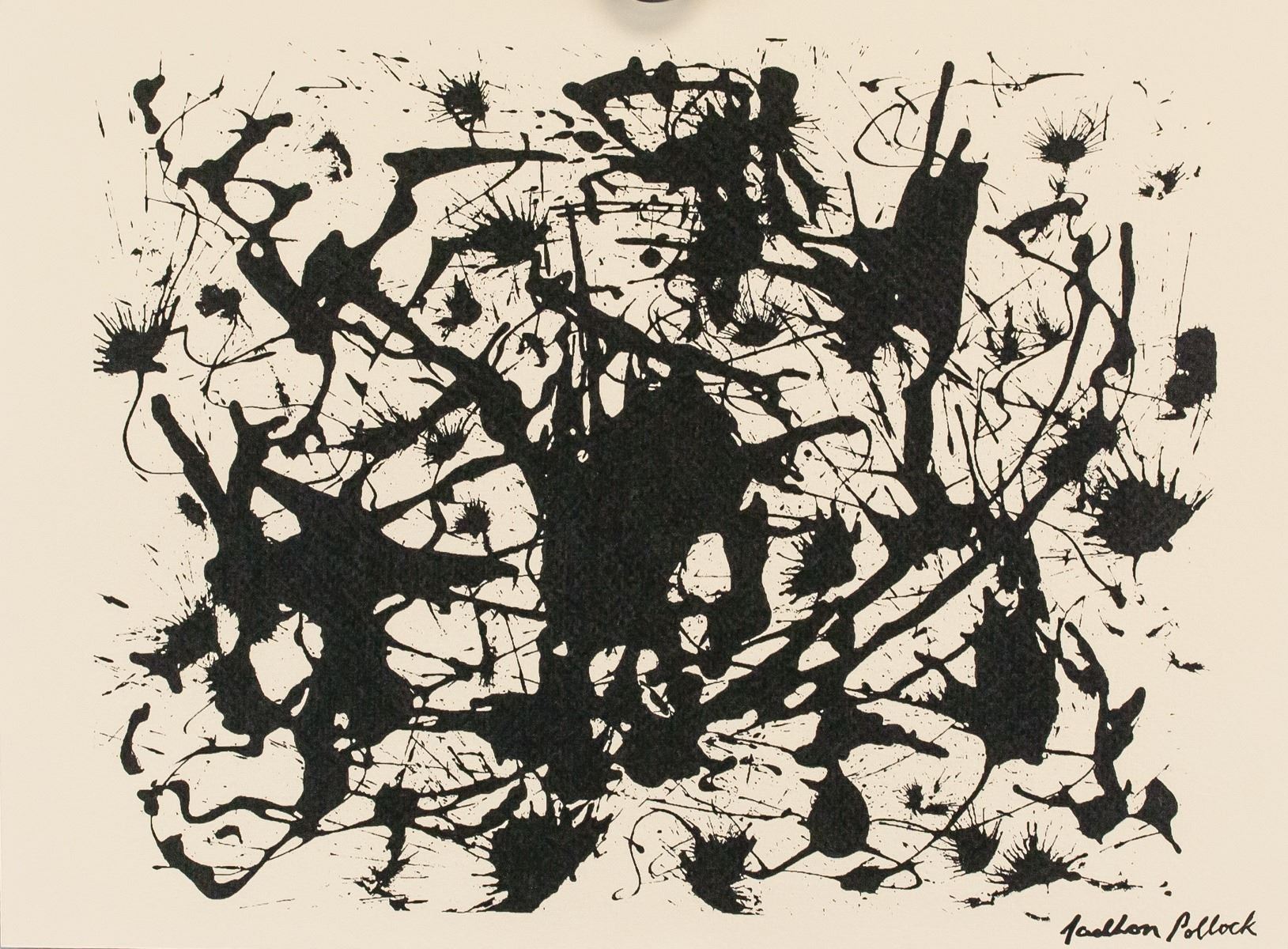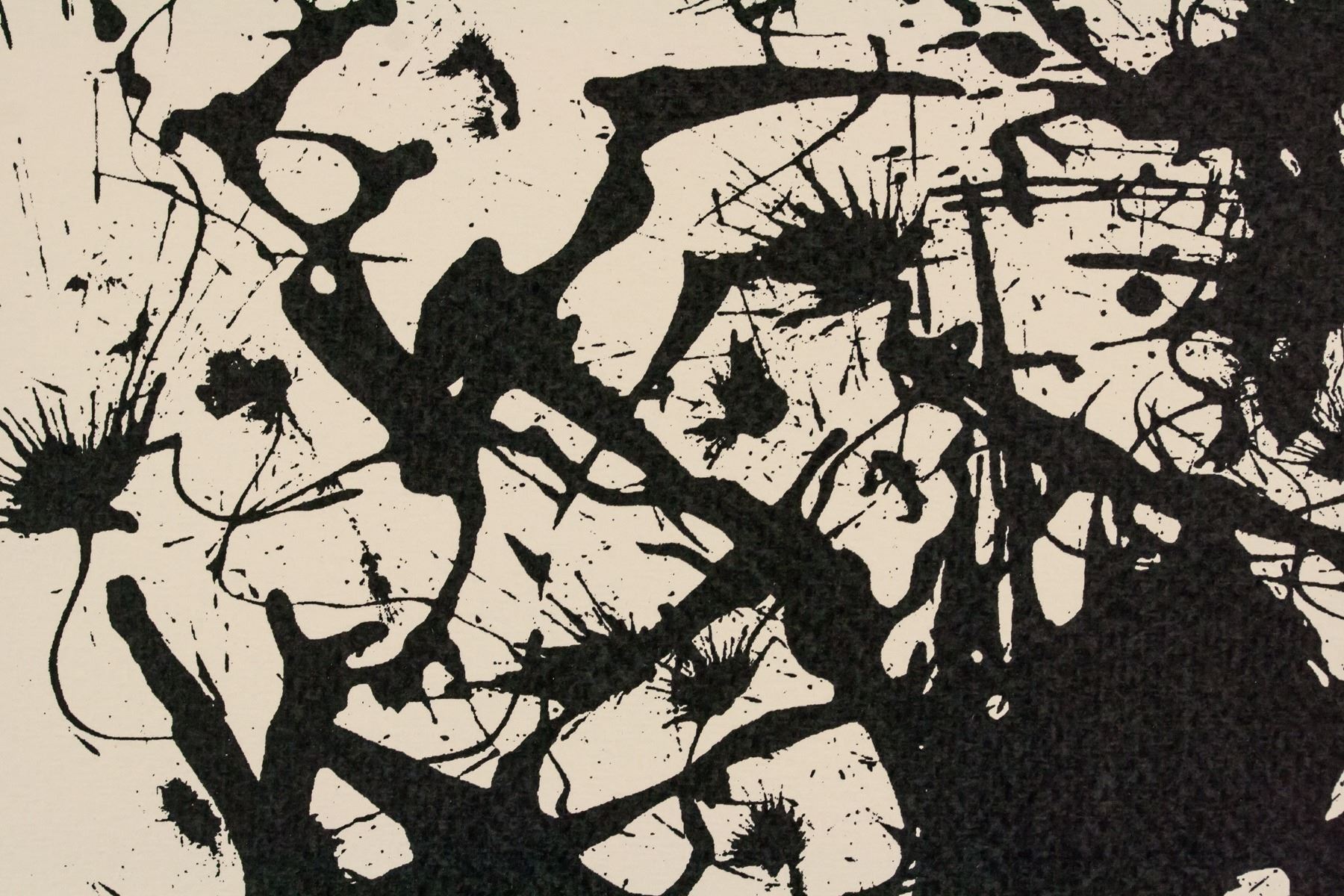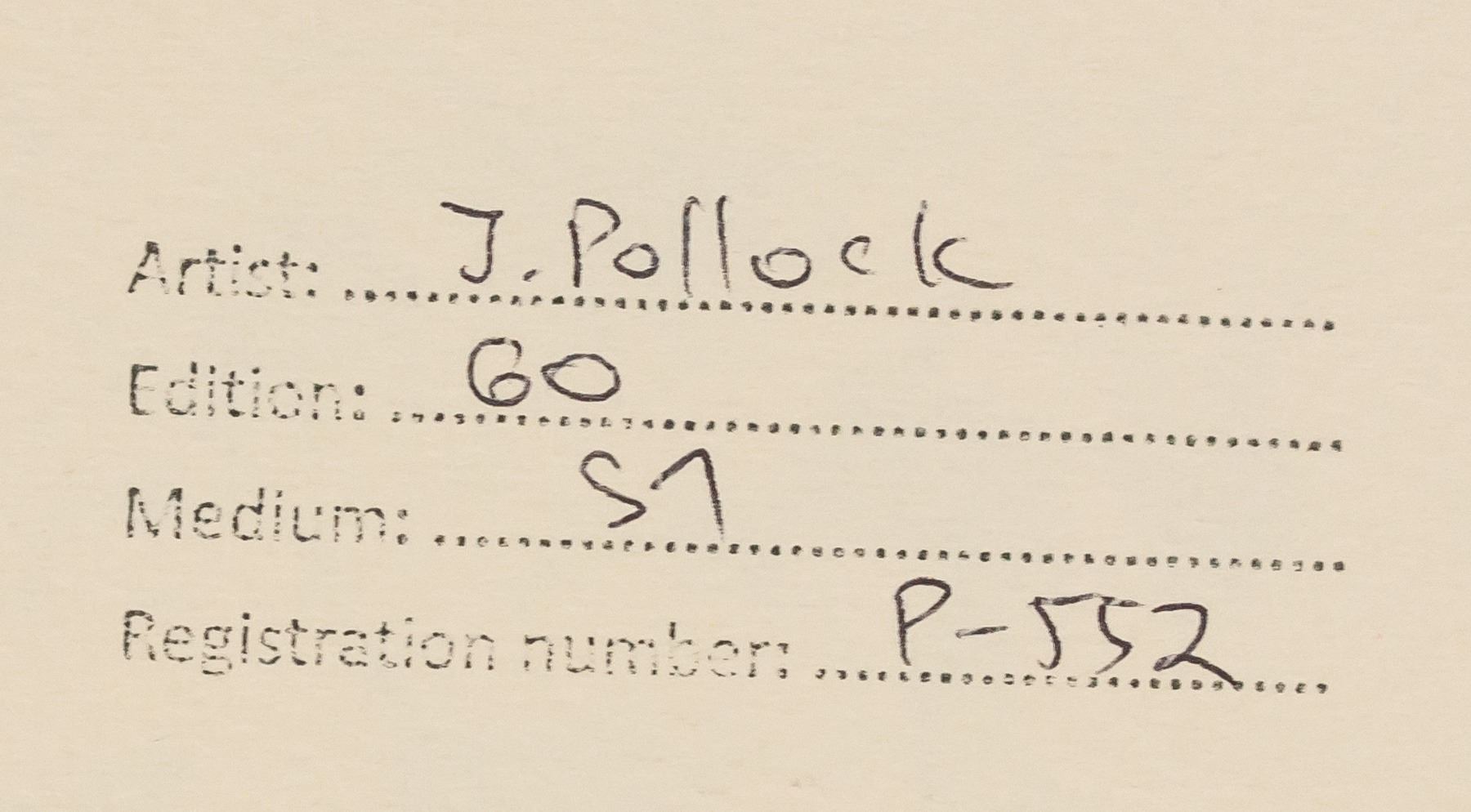Silkscreen on paper. Featuring abstract composition. Signed "Jackson Pollock" in the bottom right corner. "7" inscribed on verso. "Artist: J. Pollock Edition: 60 Medium: Sl Registration number: P-552" stamped and inscribed on verso. Attributed to Jackson Pollock (1912-1956, American). 21.5 x 29 cm (8.5 x 11.25 in). Provenance: This lot carries limited provenance from a Southern Ontario estate.