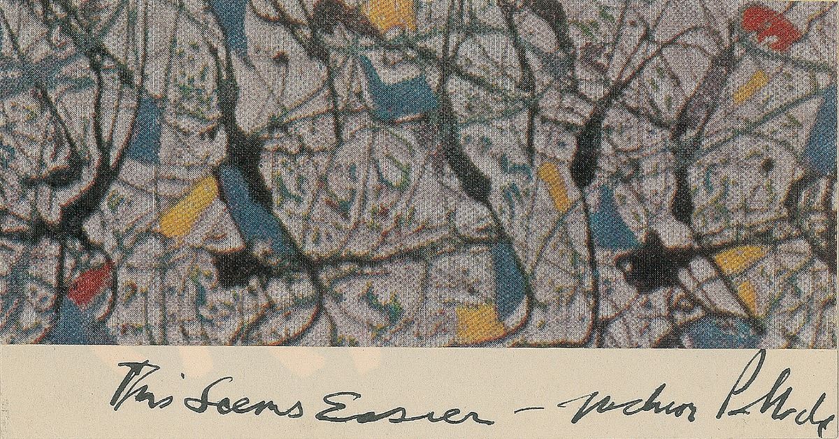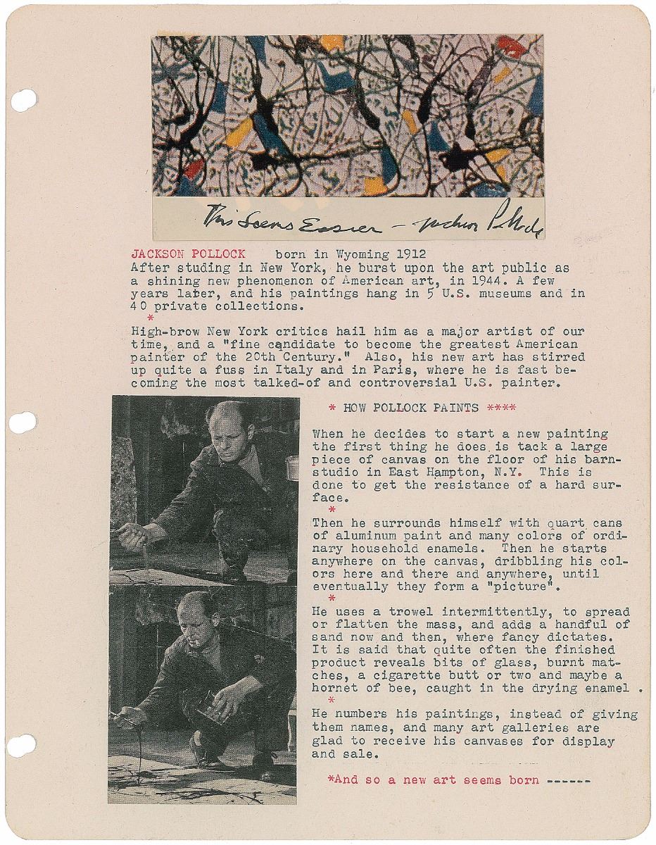 Exceedingly rare fountain pen signature, “This seems easier—Jackson Pollock,” on a trimmed page from a 1949 Betty Parsons Gallery exhibition flyer, with the image illustrated in the flyer affixed above. The page is affixed to a typewritten biographical sheet along with two other clipped magazine images of Pollock at work. In fine condition.