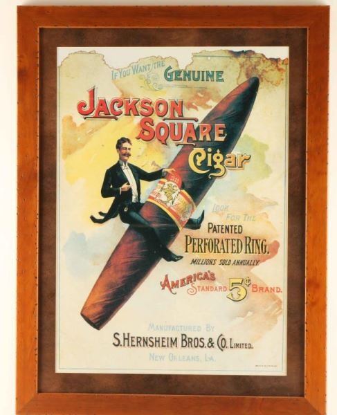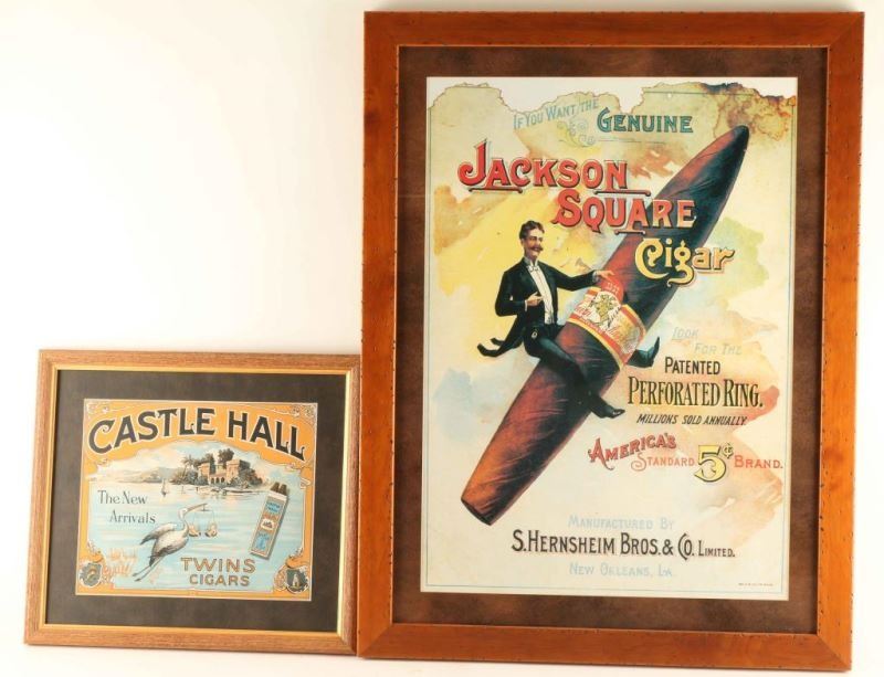 Shows a gentleman riding a cigar, reproduced from the original, wood frame, measures 25"X17". And a Castle Hill Cigar advertiser meaures 10X11"