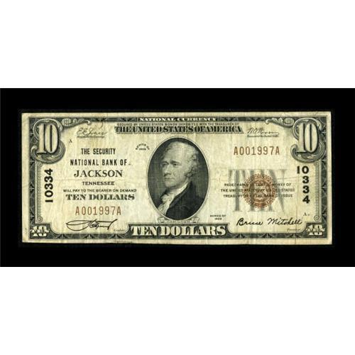 <B>Jackson, TN</B></I> - $10 1929 Ty. 1 <B>The Security NB</B></I> Ch. # 10334<BR> This evenly circulated note is new to the census. This Madison County bank would liquidate in February 1935.<B> Fine</B></I>.<BR><BR><b>Shipping:</b> Coins & Currency (<a target="_blank" href="http://www.heritageauctions.com/common/shipping.php">view shipping information</a>)