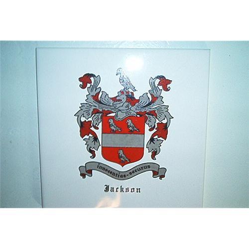 Featuring a 6" by 6" tile that displays the emblem and last name of "JACKSON". Colors are red and grey. The tile states: INNDCENT #BC-SECURUS along with the JACKSON name. The back of the tile is embossed: ENGLAND and C-12. Excellent to Mint Conditon. Shows no scratches, chips, cracks, etc.
