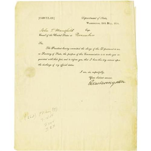 <B>Andrew Jackson's Secretary of State Edward Livingston Document Signed,</B></I> “<I>Edw Livingston</B></I>”, one page, partially printed, 8” x 9.75”, Washington, D.C., May 24, 1831. A circular announcing Livingston's cabinet appointment. Very good condition. <I>From the collection of Henry E. Luhrs.</B></I><BR><BR><b>Shipping:</b> Miscellaneous Collectibles, Smal (<a target="_blank" href="http://www.heritageauctions.com/common/shipping.php">view shipping information</a>)