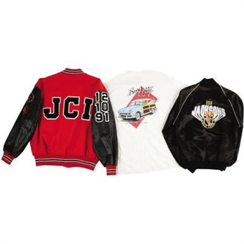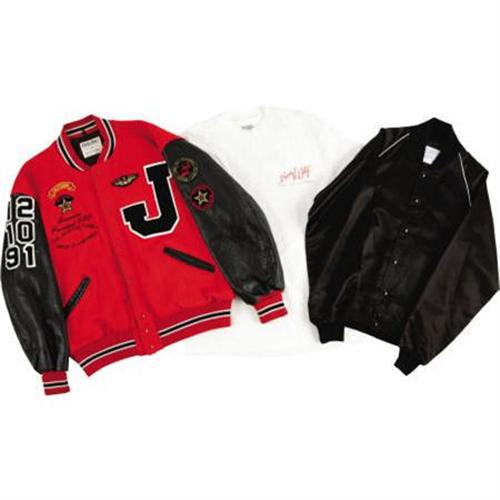 <B>Jacksons Tour Jackets and T-Shirt Signed by Michael.</B></I> Includes a black satin Jacksons World Tour '84 jacket (no tag), a red-and-black varsity-style Jackson Companies Inc. jacket with Jermaine's name embroidered on the right breast (XL), and a "Surf City" t-shirt signed by Michael in gold marker (L). All are in Excellent condition, and the autographed shirt is accompanied by a letter of authenticity.<BR><BR><b>Shipping:</b> Clothing, Costumes & Jerseys (<a target="_blank" href="http://www.heritageauctions.com/common/shipping.php">view shipping information</a>)