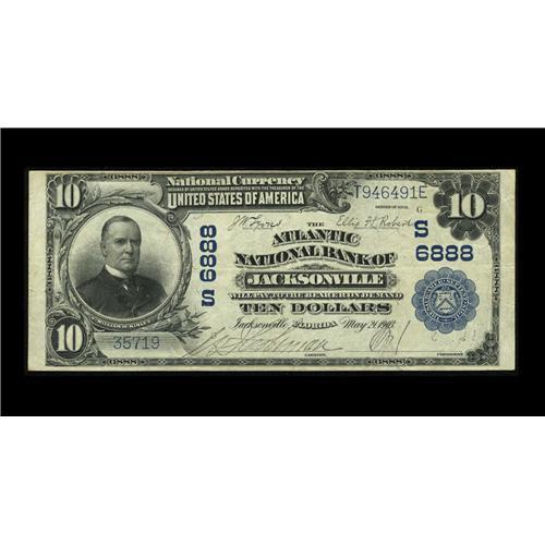 <B>Jacksonville, FL</B></I> - $10 1902 Plain Back Fr. 624 <B>The Atlantic NB</B></I> Ch. # (S)6888<BR>Stamped signatures are found on this $10 from the largest national bank in Jacksonville during the late 1920s. <B>Very Fine.</B></I><BR><BR><b>Shipping:</b> Coin/Currency (<a target="_blank" href="http://www.heritageauctions.com/common/shipping.php">view shipping information</a>)