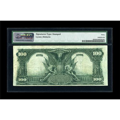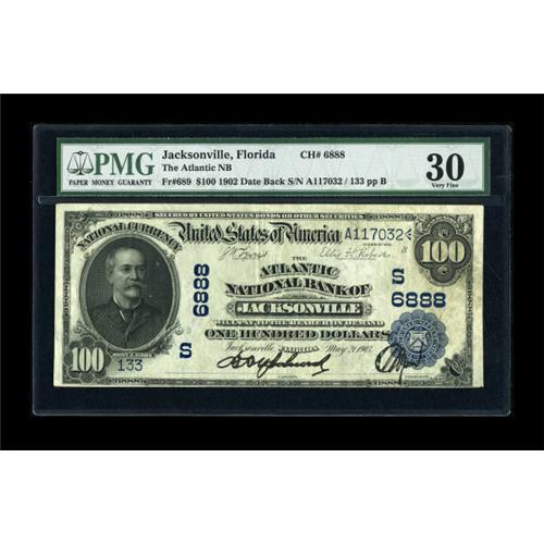 <B>Jacksonville, FL</B></I> - $100 1902 Date Back Fr. 689 <B>The Atlantic NB</B></I> Ch. # (S)6888<BR> This is the only $100 Date Back or Plain Back known from all Florida banks combined, not that there were many issuers of high denomination examples during the period 1908 through 1929. Just three banks elected to issue $100 Date Backs, with a total of only 1300 pieces produced for all three issuers. Interestingly, while this is the sole Blue Seal hundred known from Florida, the census stands at three $100 Red Seals, all from this bank and all celebrated as the rarities they are. As this is the only $100 Date or Plain Back known from Florida, it stands as the key piece to completing a set of this state's Nationals by type and denomination, a feat which can only be accomplished by the bidder determined enough to outlast his compatriots and bring this trophy note home. PMG <B>Very Fine 30,</B></I> with a few pinholes far outweighed by the note's dark signatures and overall eye appeal.<BR><I>From The Sunshine State Collection.</B></I><BR><BR><b>Shipping:</b> Coins & Currency (<a target="_blank" href="http://www.heritageauctions.com/common/shipping.php">view shipping information</a>)