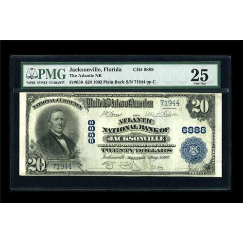 <B>Jacksonville, FL</B></I> - $20 1902 Plain Back Fr. 650 <B>The Atlantic NB</B></I> Ch. # 6888<BR> A second opportunity to own a Plain Back from this Jacksonville institution, with this example graded <B>Very Fine 25</B></I> by PMG. <BR><I>From The Sunshine State Collection.</B></I><BR><BR><b>Shipping:</b> Coins & Currency (<a target="_blank" href="http://www.heritageauctions.com/common/shipping.php">view shipping information</a>)