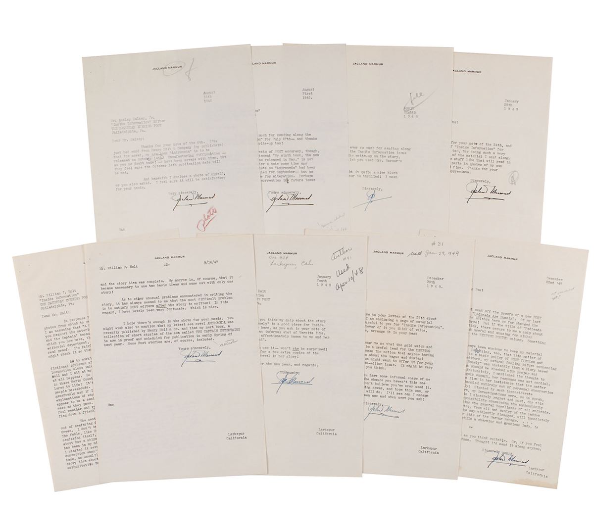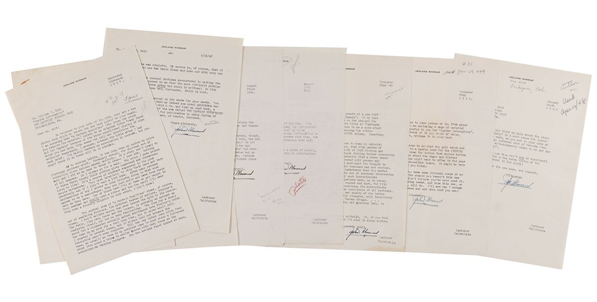 Polish-born American author (1901-1970) best known for his Naval stories in The Saturday Evening Post and Colliers. Collection of eight letters to editors at the Saturday Evening Post regarding various stories, six signed in full, one signed “Jac Marmud,” and one initialed. Several are accompanied by carbon copies of the letters to which he is responding. In overall very good to fine condition.