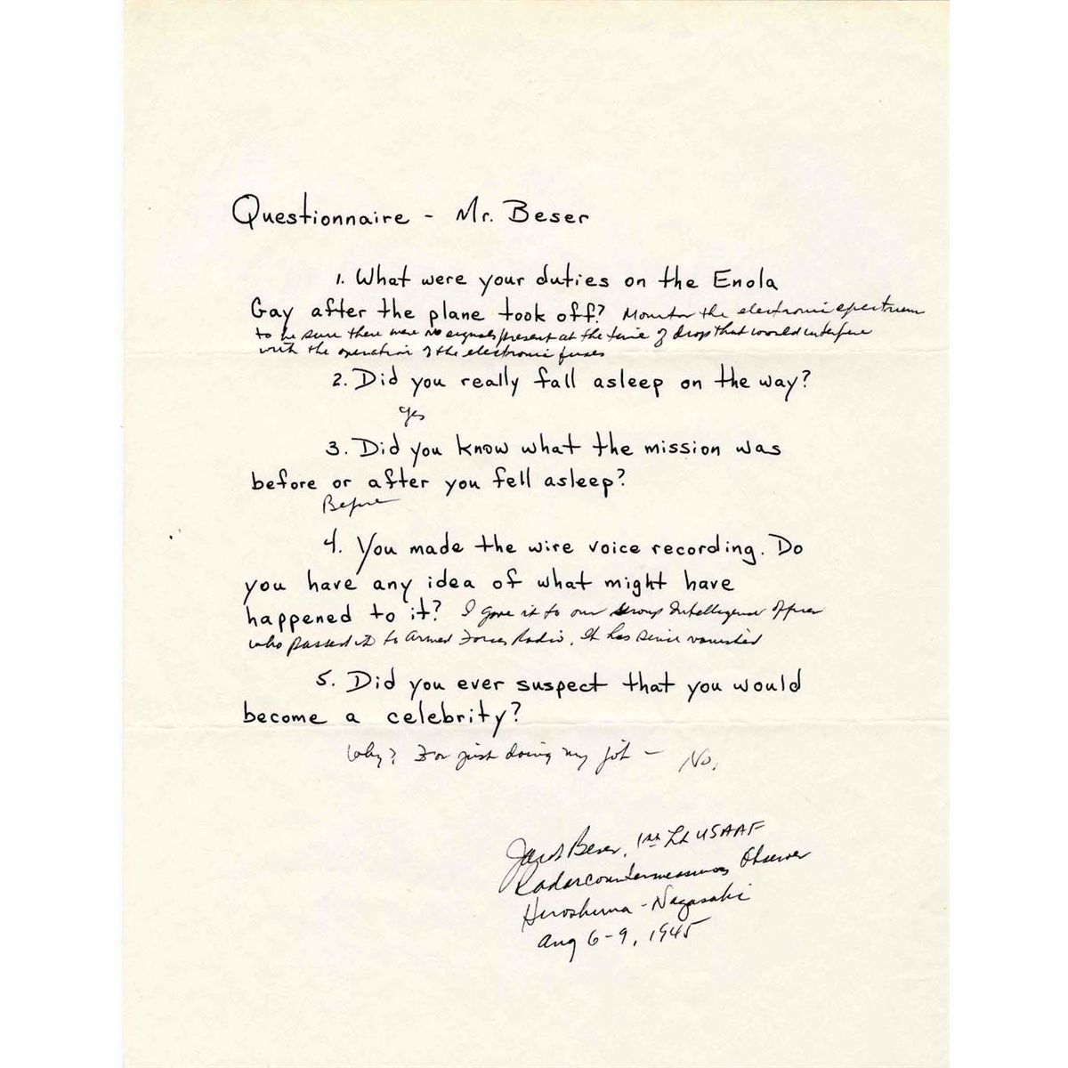 Lengthy questionnaire filled out and signed by Jacob Beser, radar specialist for the Enola Gay and Bockscar (the only crew member to serve both missions). In response to the question, ''You made the wire voice recording. Do you have any idea of what might have happened to it?'' Beser replies, ''I gave it to our Group Intelligence Officer who passed it to Armed Forces Radio. It has since vanished.'' Signed at the conclusion ''Jacob Beser, 1st Lt. USAAF / Radar Countermeasures Observer / Hiroshima - Nagasaki / Aug 6-9, 1945''. 8.5'' x 11''.