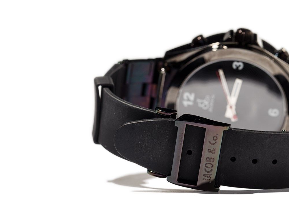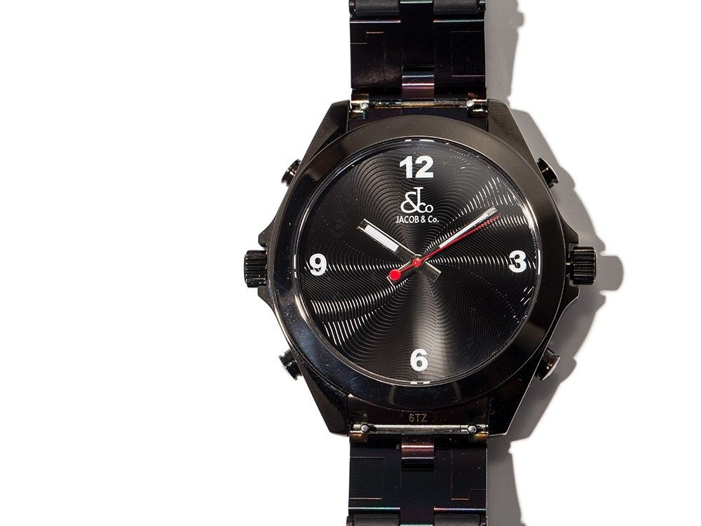 This 5 time zone watch by Jacob 6 Co. was made in the US around 2010. The watch is fitted with a quartz movement and displays hour, minute, second and date. The two silver dials show silver and red hands. Watch case, crown and folding clasp are made of stainless steel. The watch has a black strap of natural rubber.