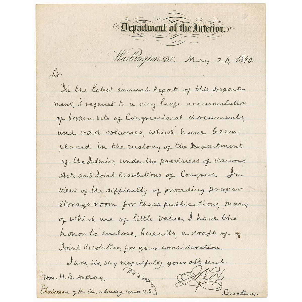Union Army general during the American Civil War, and later a Republican politician from Ohio. He served as the 28th Governor of Ohio and as United States Secretary of the Interior. LS signed “J. D. Cox,” one page, lightly-lined, 7.75 x 10, Department of the Interior letterhead, May 26, 1870. Letter to Senator H. B. Anthony, Chairman of the House Committee on Printing. In part: “In the latest annual report of this Department, I referred to a very large accumulation of broken sets of Congressional documents and odd volumes which have been placed in the custody of the Department of the Interior…In view of the difficulty of providing proper storage room…many of which are of little value, I have the honor to inclose, herewith, a draft of a Joint Resolution.” In fine condition, with a uniform shade of mild toning, and some scattered light soiling.