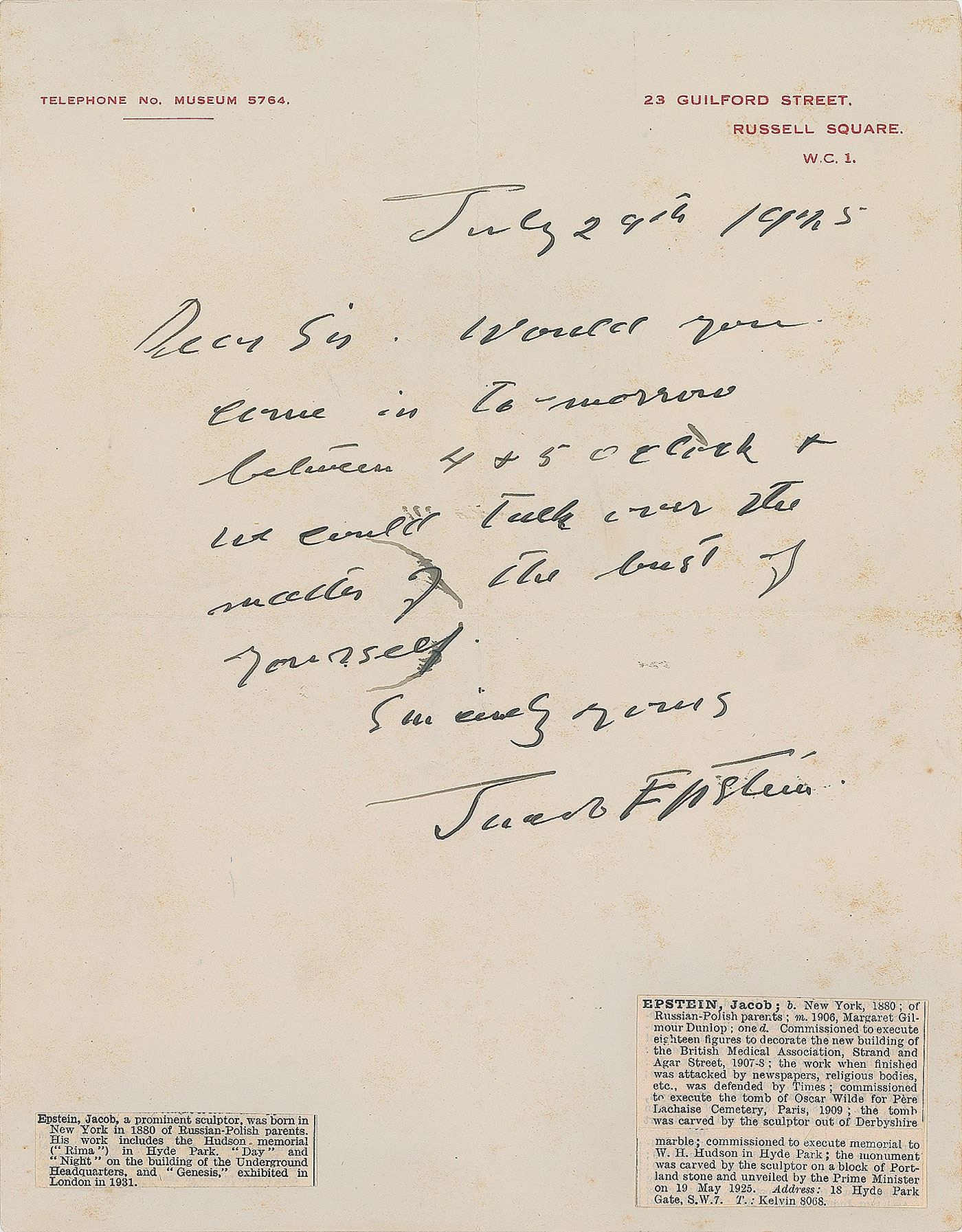 American-born Jewish sculptor (1880–1959) who worked primarily in Great Britain and whose nude public sculptures stirred up much controversy in his lifetime. ALS, one page, 7 x 9, personal letterhead, July 29, 1935. Letter concerning a commission, in full: "Would you like to come in to-morrow between 4 & 5 o'clock & we could talk over the matter of the bust of yourself." In fine condition, with scattered light foxing and several affixed newspaper clippings.