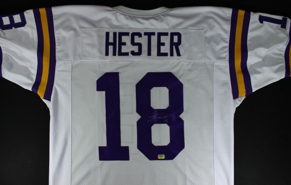 On-field style jersey. Everything is sewn on, size XL. Hand-signed in silver paint pen by Jacob Hester (Chargers). Autograph includes an Absolute Authentic Autographs (AAA) hologram and matching COA. The signing of this item was witnessed by AAA.