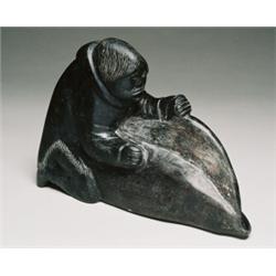 A dark grey stone carving of a hunter flensing a walrus, signed in Roman and inscribed with the carver number.