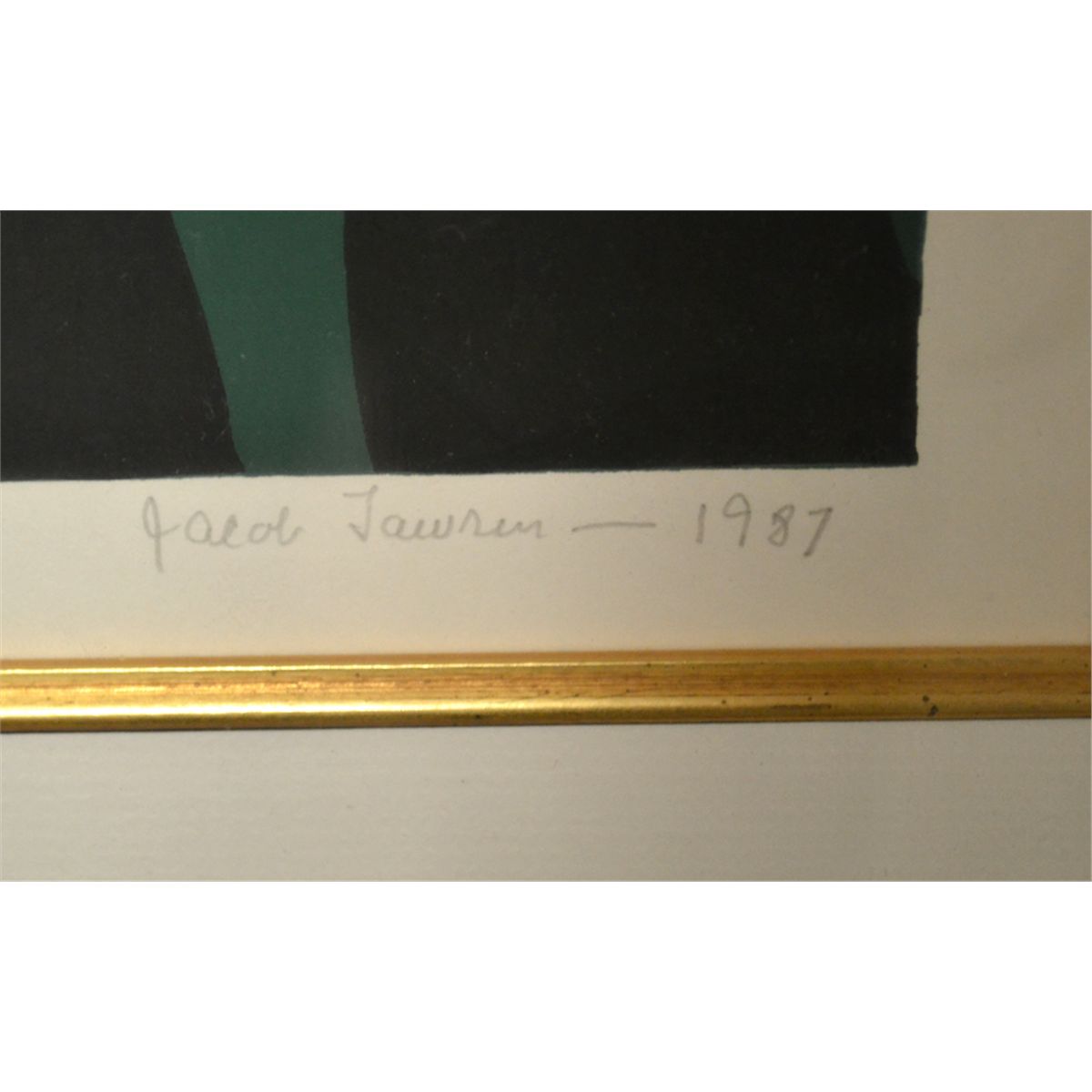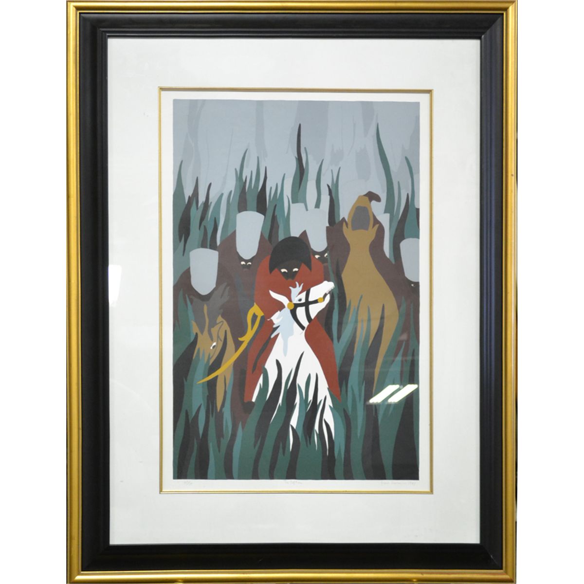 Titled, "The Capture," colorful lithograph depicting a female on a horse with other figures surrounding her in tall grass. Edition 102/120 in lower left, titled in lower center, and signed Jacob Lauren and dated 1987 in lower right. Matted and in a painted gold and black frame and behind glass. 43.25" H x 33.5" W, including the frame. Circa 20th century. Private collection Ft. Gratiot, MI.
