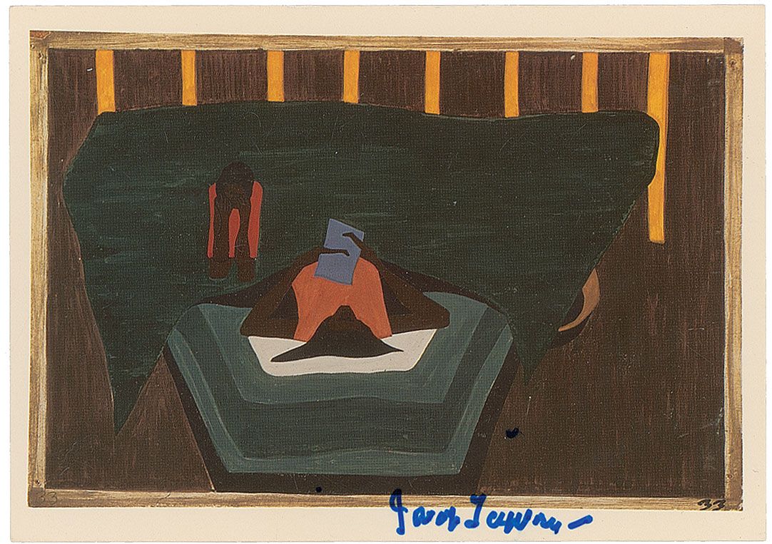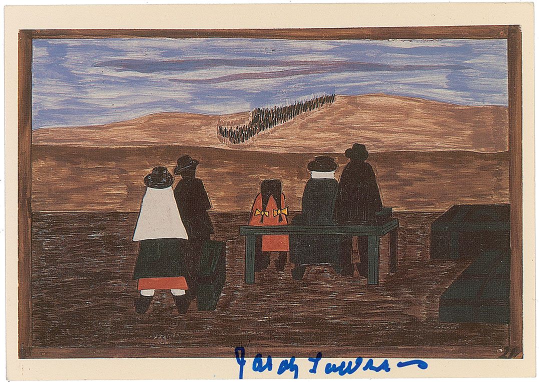 Two color postcards of Lawrence’s works, both 6 x 4.25, each signed in the lower border in blue felt tip. In overall fine condition.