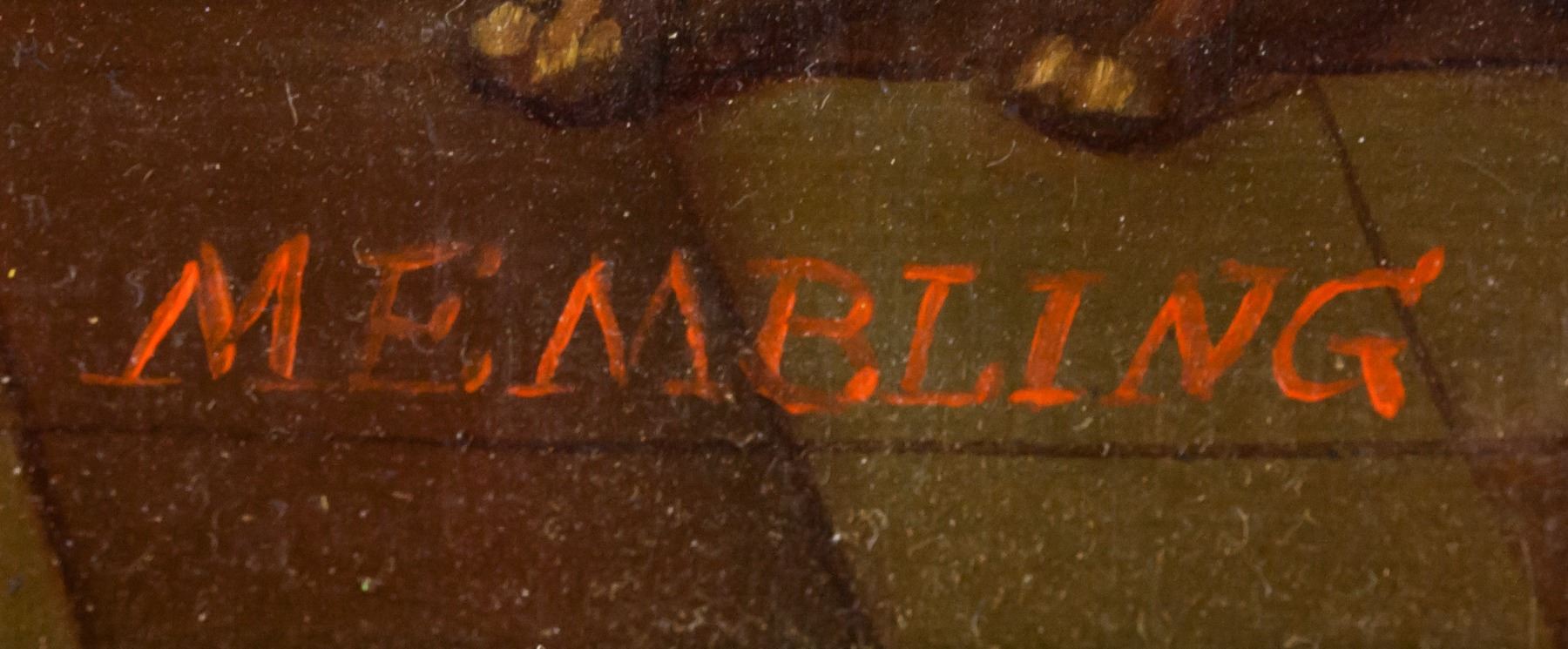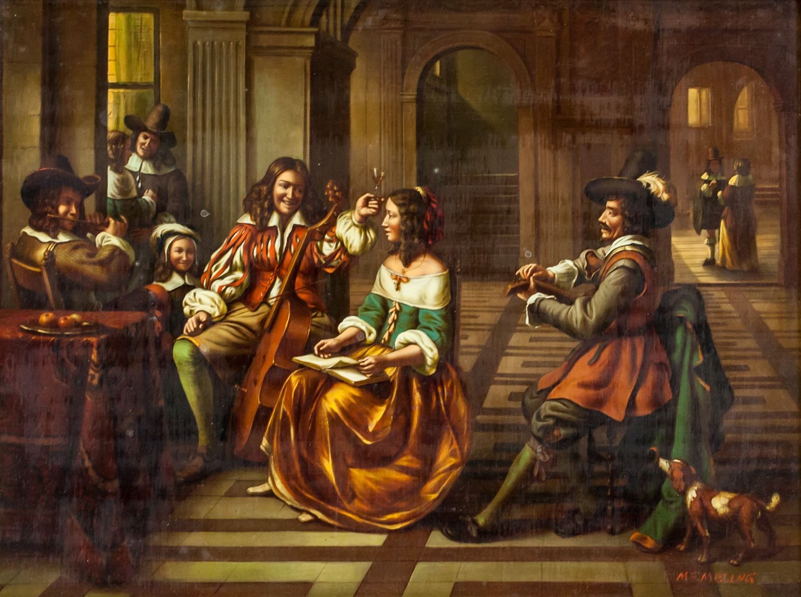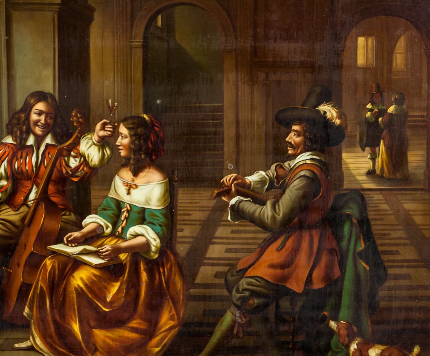 Oil on board, gilt framed. Featuring a portrait Dutch-style interior scene with seated musicians. Signed MEMBLING on the lower right corner. Inscribed on verso P812GK / 32258. Stamped illegibly on verso. Attributed to Jacob Membling (1853-1928, Austrian). 30 x 40 cm (11.8 x 15.7 inches). Frame size: 46 x 56 cm (18.1 x 22 inches)
