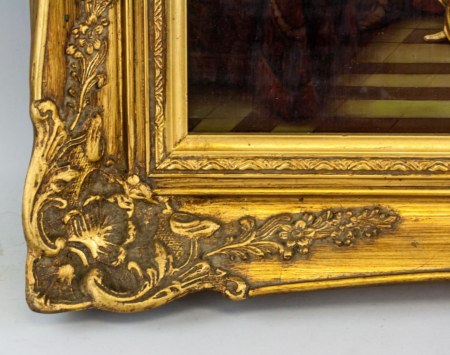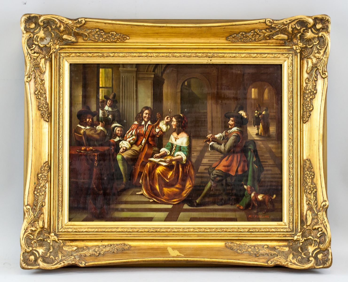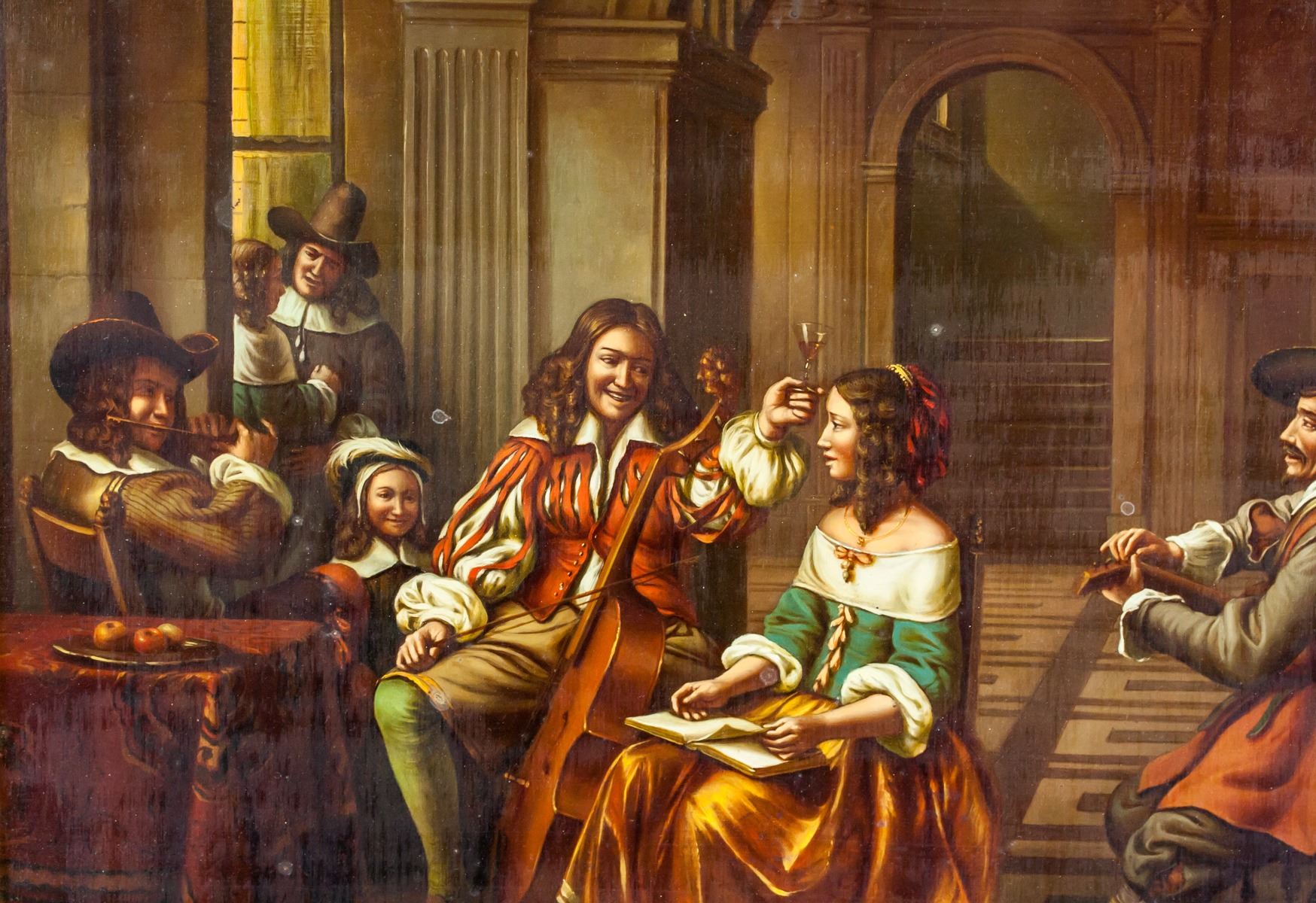 Oil on board, gilt framed. Featuring a portrait Dutch-style interior scene with seated musicians. Signed MEMBLING on the lower right corner. Inscribed on verso P812GK / 32258. Stamped illegibly on verso. Attributed to Jacob Membling (1853-1928, Austrian). 30 x 40 cm (11.8 x 15.7 inches). Frame size: 46 x 56 cm (18.1 x 22 inches)