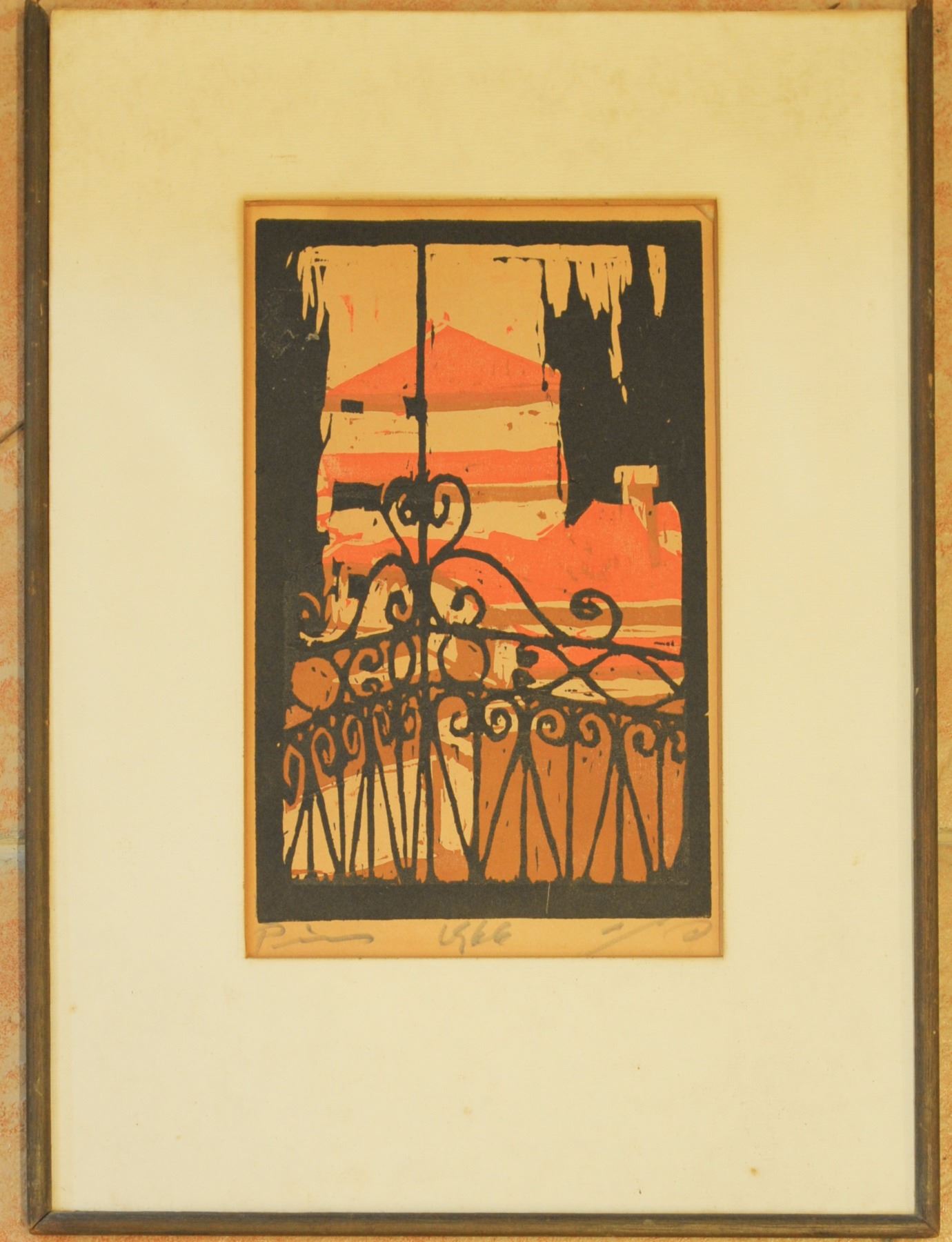 Jacob Pins (1917-2006), view from a balcony, woodcut, pencil-signed and dated 1960, framed, damaged frame, dimensions: 14x24 cm.