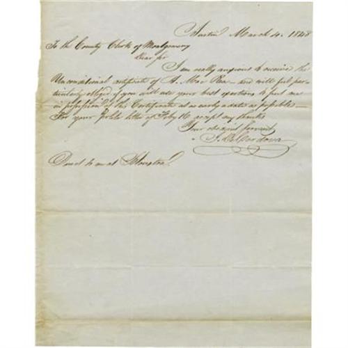 <B>Jacob Raphael De Cordova Autograph Letter Signed</B></I> "<I>J. De Cordova</B></I>," one page, 7.75" x 9.75". Austin, March 4, 1848. To the County Clerk of Montgomery. In full, "<I>I am really anxious to receive the Unconditional certificate of H. Mac Rea - and will feel particularly obliged if you will use your best exertions to put me in possession of this Certificate at as early a date as possible - For your polite letter of Feby 16 accept my thanks.</B></I>" De Cordova adds "<I>Direct to me at Houston.</B></I>" Jacob Raphael De Cordova (1808-1868) was born in Spanish Town, Jamaica, but was reared by an aunt in England because his mother had died in childbirth. His father, a Jewish coffee grower, moved to Philadelphia where he became president of Congregation Mikveh Israel in 1820. Jacob joined his father in Philadelphia, married, and learned the printing trade. He returned to Jamaica in 1834 where he and his brother started a newspaper, the "Kingston Daily Gleaner." In 1836, Jacob went to New Orleans where he shipped cargoes of staples to Texas during its struggle for independence. As Grand Master of the Odd Fellows, he visited the Texas Republic to install members in Odd Fellows lodges, the first established outside the United States. Jacob settled in Galveston, Texas in 1839, then moved to Houston where, in 1847, he was elected as a state representative to the Second Texas Legislature. This letter was written by Jacob De Cordova from the state capital during his one two-year term in the state legislature. Through scrip and direct purchase, De Cordova acquired large amounts of land to sell to settlers. He made speeches in New York, Philadelphia, and other U.S. cities on the desirability of living in Texas and even traveled to England to speak to a cotton-spinners association in Manchester. His lectures were published and were widely read. De Cordova was one of three men who laid out the town of Waco in 1848-1849. Normal folds and two browned folds in blank left and lower edges. Small portion missing at upper blank left. Very good condition.<B>Condition Report:</B> <BR><BR><b>Shipping:</b> Flat Material, Small (<a target="_blank" href="http://www.heritageauctions.com/common/shipping.php">view shipping information</a>)