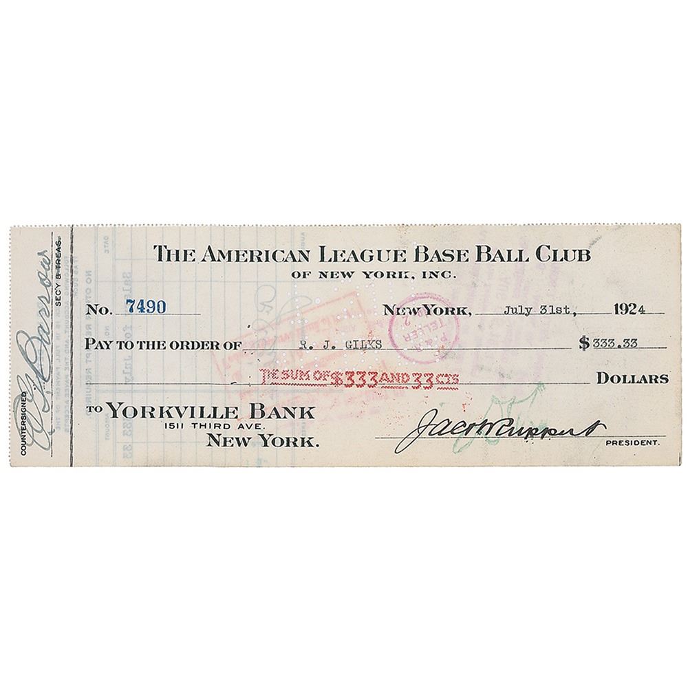 The American League Base Ball Club of New York business check, 9 x 3.25, filled out in type and signed by Ruppert, "Jacob Ruppert," and countersigned by Ed Barrow, "E. G. Barrow," payable to R. J. Gilks for $333.33, July 31, 1924. Also endorsed by Gilks on the reverse. In fine condition. The recipient of this check, Bob Gilks, played professional baseball during the late 19th century and went on to be a scout for the Yankees.