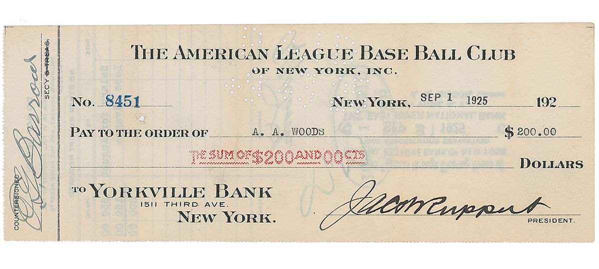 The American League Base Ball Club of New York business check, 9 x 3.25, filled out in type and signed by Ruppert, “Jacob Ruppert,” and countersigned by Ed Barrow, “E. G. Barrow,” payable to A. A. Woods for $200, stamp-dated September 1, 1925. In fine condition, with a vertical fold and expected bank notations and cancellation holes. Woods was the team’s trainer. Both Yankees executives are now members of the Baseball Hall of Fame, with Ruppert recently being inducted in 2013.