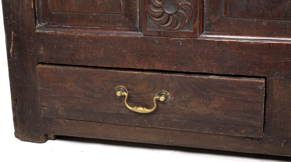 Offered in this lot we have a Jacobean hand carved blanket chest originating from 1820- 1830. The Jacobean era refers to the period in English and Scottish history that coincides with the reign of James VI of Scotland (1567–1625), who also inherited the crown of England in 1603 as James I. The Jacobean era succeeds the Elizabethan era and precedes the Caroline era, and is often used for the distinctive styles of Jacobean architecture, visual arts, decorative arts, and literature which characterized that period. The chest features a wonderful hand carved stylized floral pattern across the front. It shows a large top opening blanket chest with a single divider in the center, as well as two small drawers across the bottom. The chest is in very good condition showing wear indicative of age. It measures 52 1/2" wide by 22" deep by 33 1/4" tall.