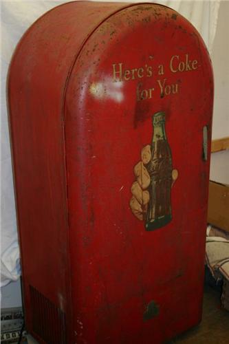 Jacobs Coke box - a very nice cabinet suitable for restoration. Inside drum and cooling unit are present. Handle and bottle opener missing. Door shuts and closes with no problem.