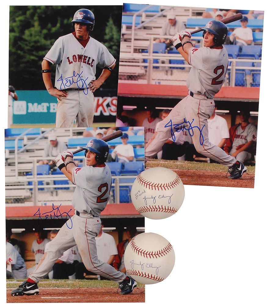 Five items: two official Rawlings Major League baseballs, each signed in blue ballpoint on the sweet spot, with Ellsbury adding “2005 1st Round” to one; and three color satin-finish 8 x 10 photos of Ellsbury playing in the minor leagues with the Lowell Spinners, each signed in blue felt tip. In overall fine condition.